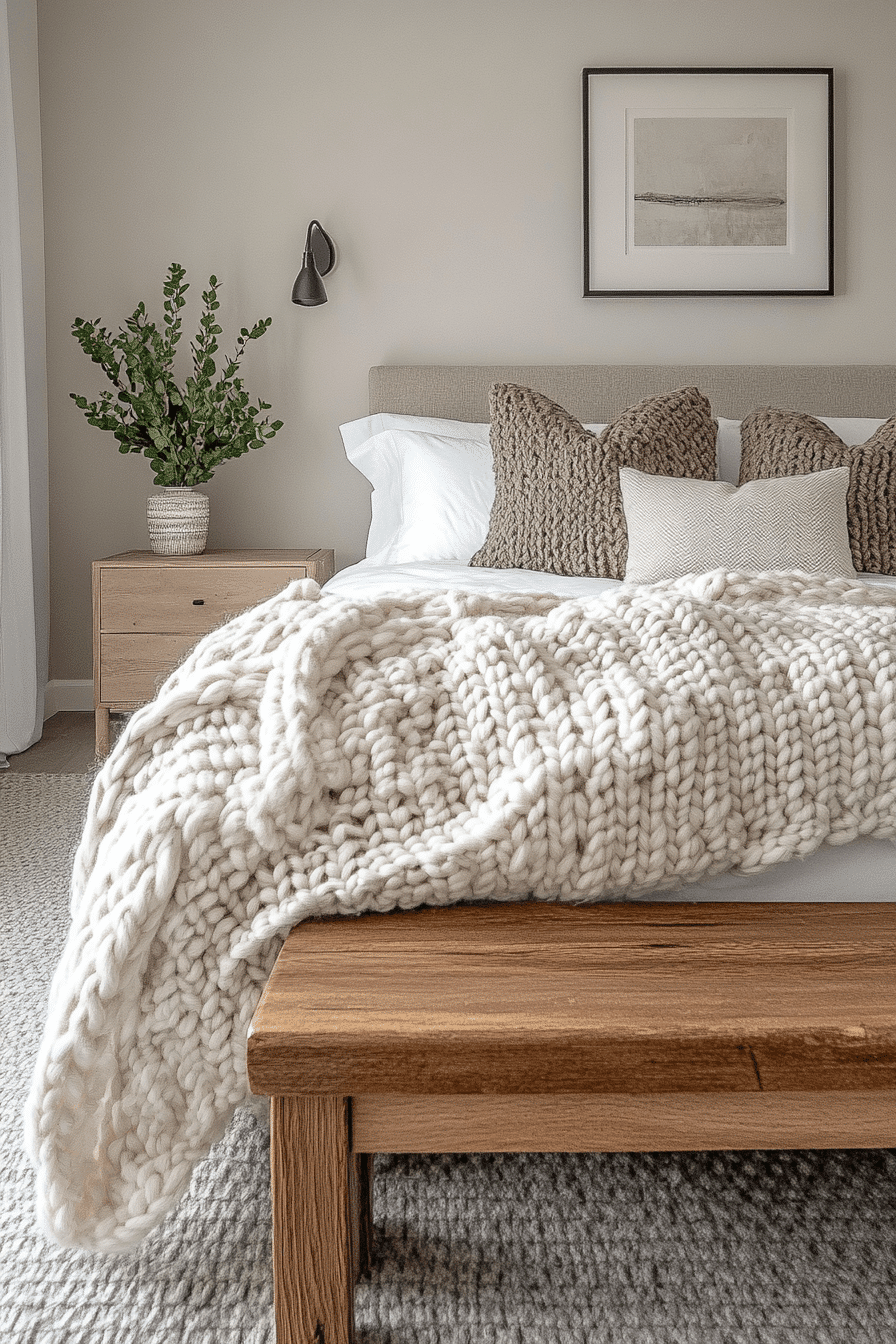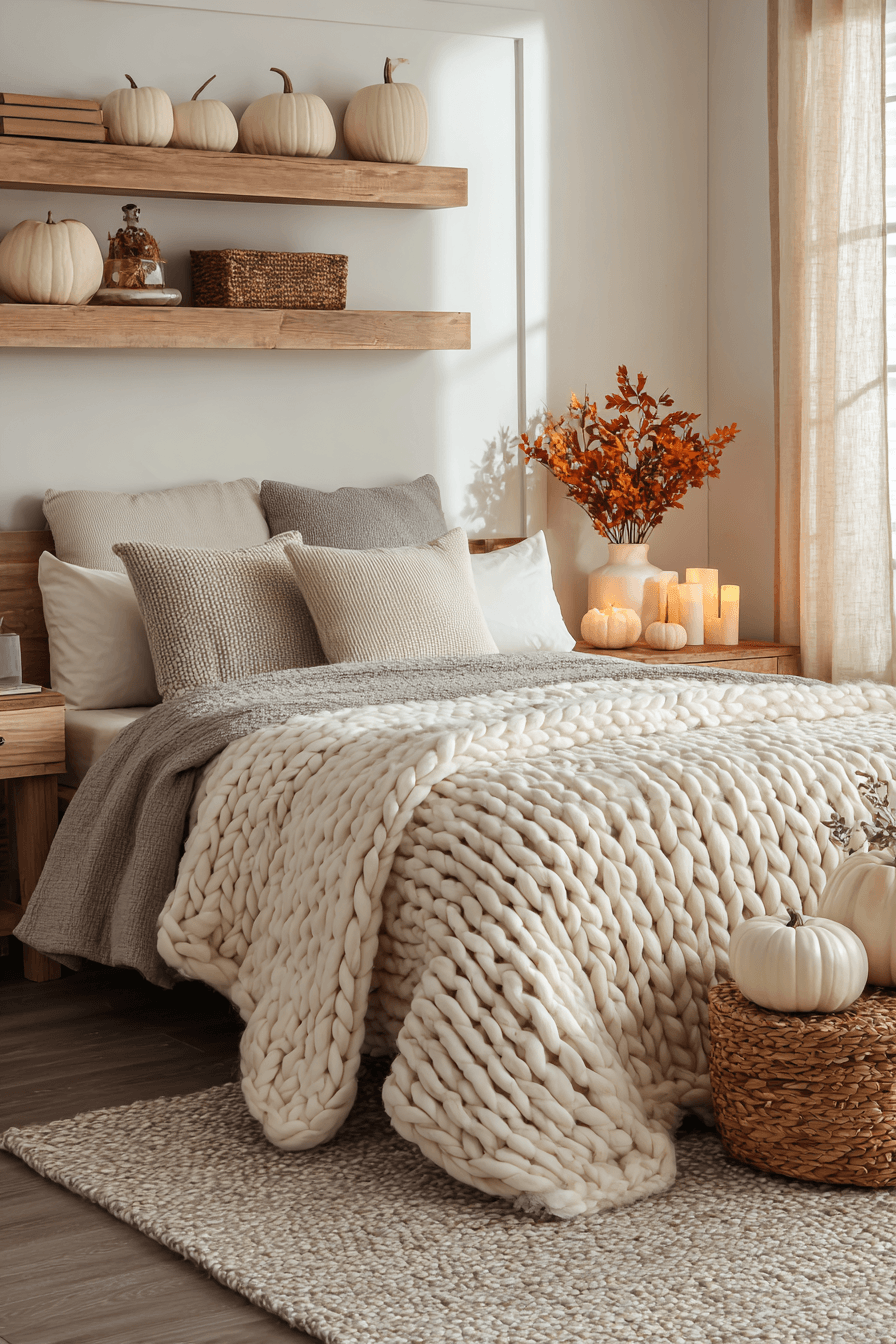 A chunky knit blanket instantly upgrades fall bedroom decor. Its oversized texture creates a cozy, luxurious feel. Neutral colors keep it versatile, while warm shades add a seasonal pop. Draping it over the bed enhances both style and function. It’s perfect for snuggling during chilly evenings. Tap here for more blanket styling tips in fall bedroom decor!