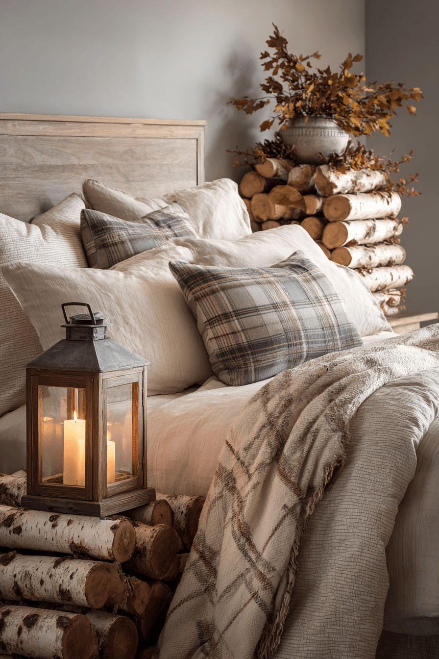 Birch logs make a rustic and charming accent in fall bedroom decor. Their pale wood tone contrasts beautifully with warm autumn hues. Use them as a decorative stack or candle base by the nightstand. They bring a woodland vibe indoors. This detail adds texture and authenticity to your space. Discover more woodsy fall bedroom decor accents by clicking here!