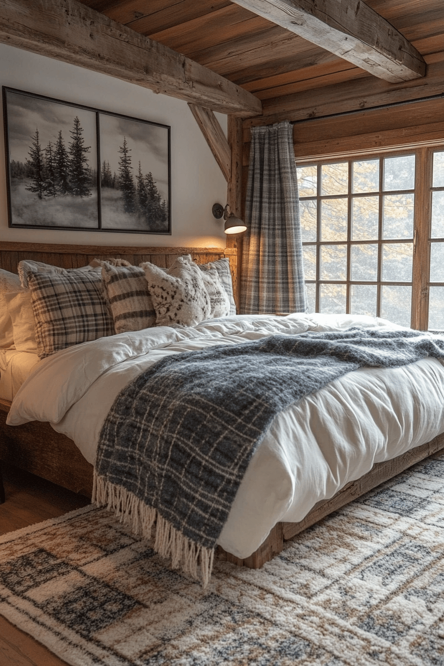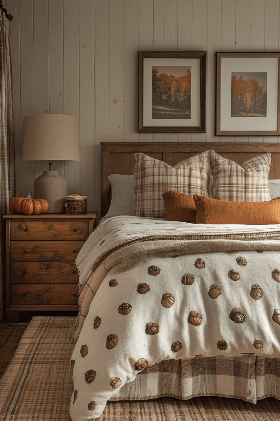 Cabin-style bedding adds rustic charm to fall bedroom decor. Plaid, flannel, and earthy tones capture the feel of a woodland retreat. Layering these elements creates a cozy, inviting atmosphere. The look is perfect for both modern and traditional bedrooms. It’s a timeless way to embrace the season. Click here to explore more cabin-inspired fall bedroom decor ideas!