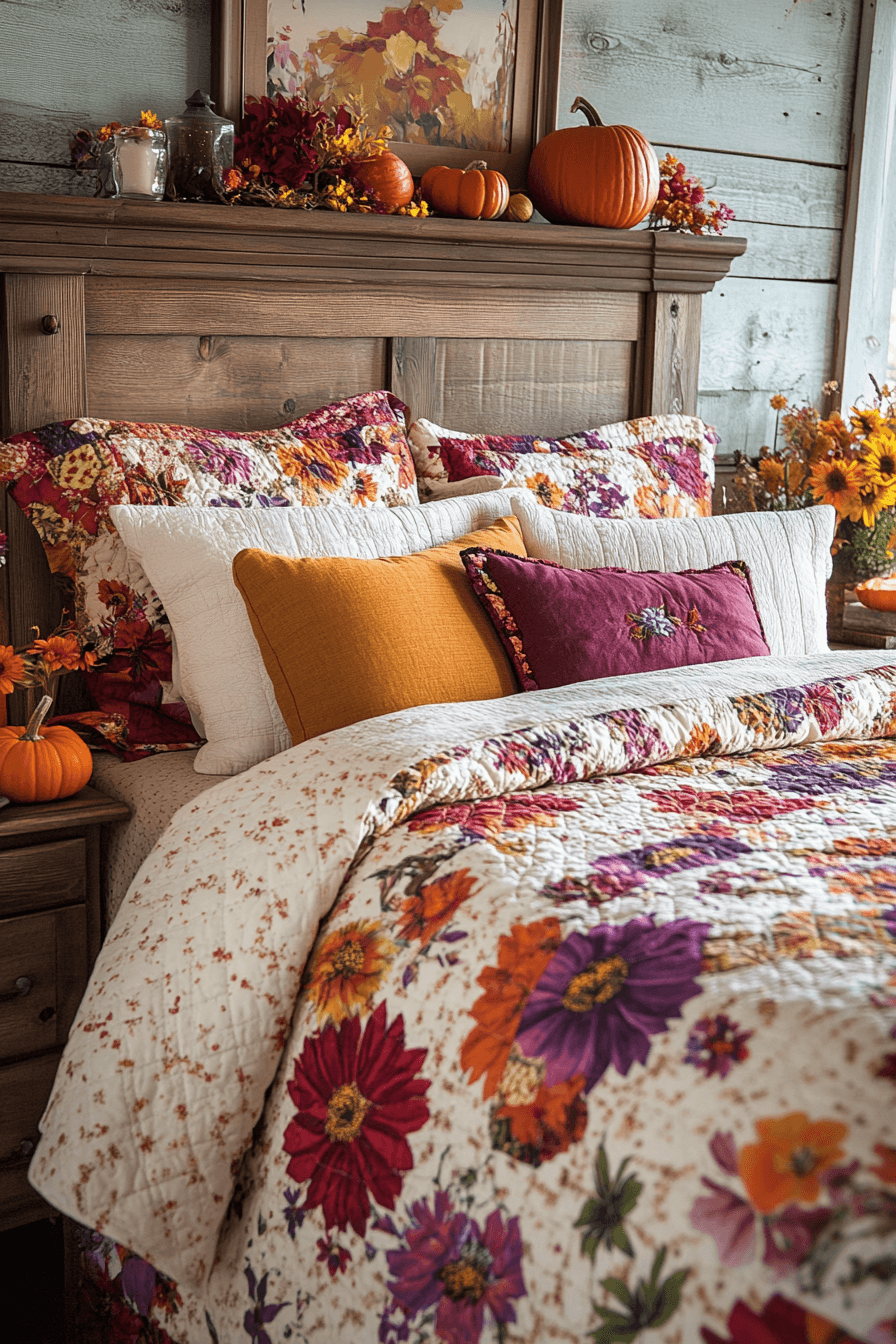 A quilt with autumn florals brings seasonal beauty into fall bedroom decor. Deep reds, oranges, and yellows add instant warmth. Layering it with neutral sheets balances the boldness. Quilts add both comfort and nostalgia to the space. This piece makes your room feel like a cozy autumn getaway. Tap here to explore more quilt designs for fall bedroom decor!