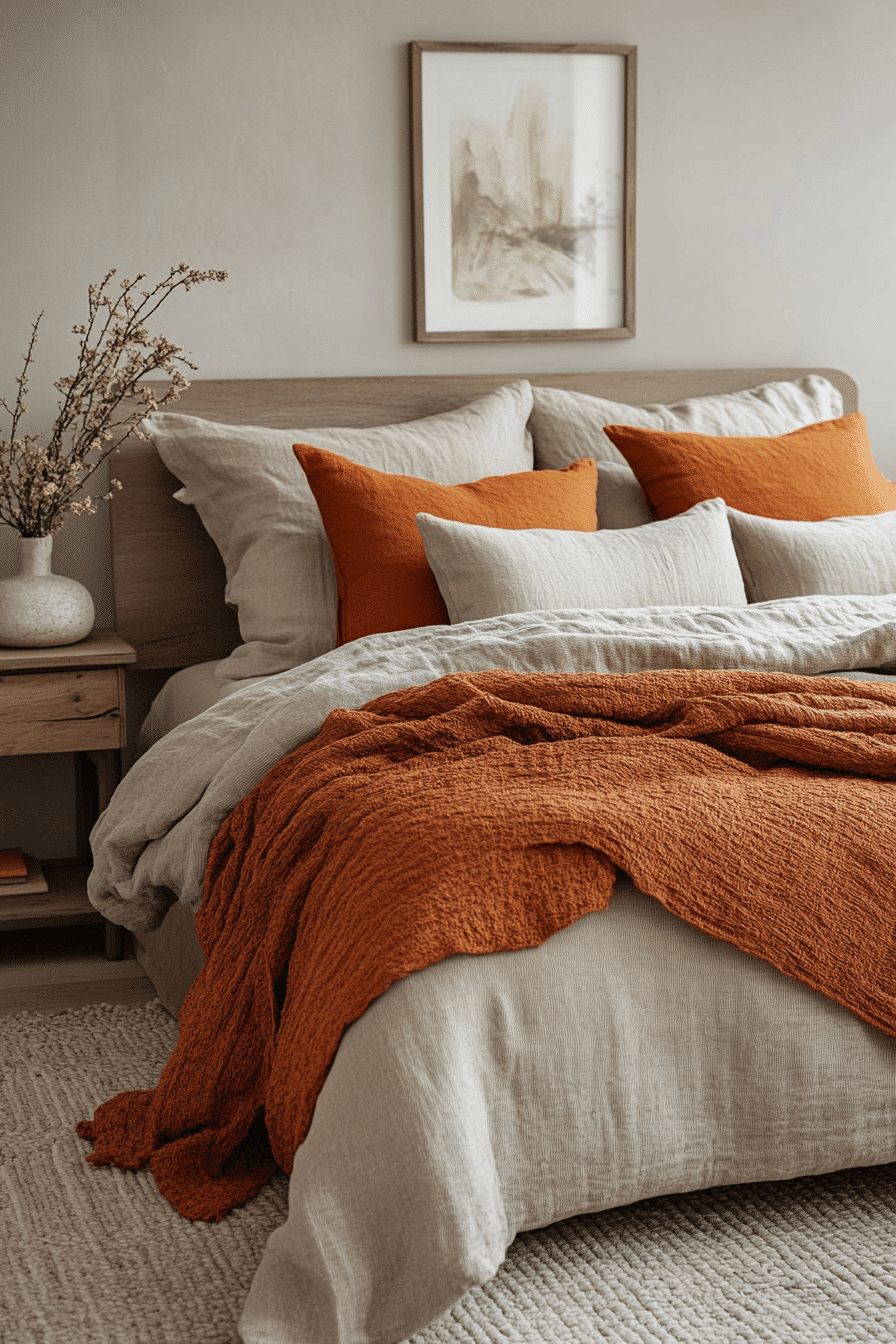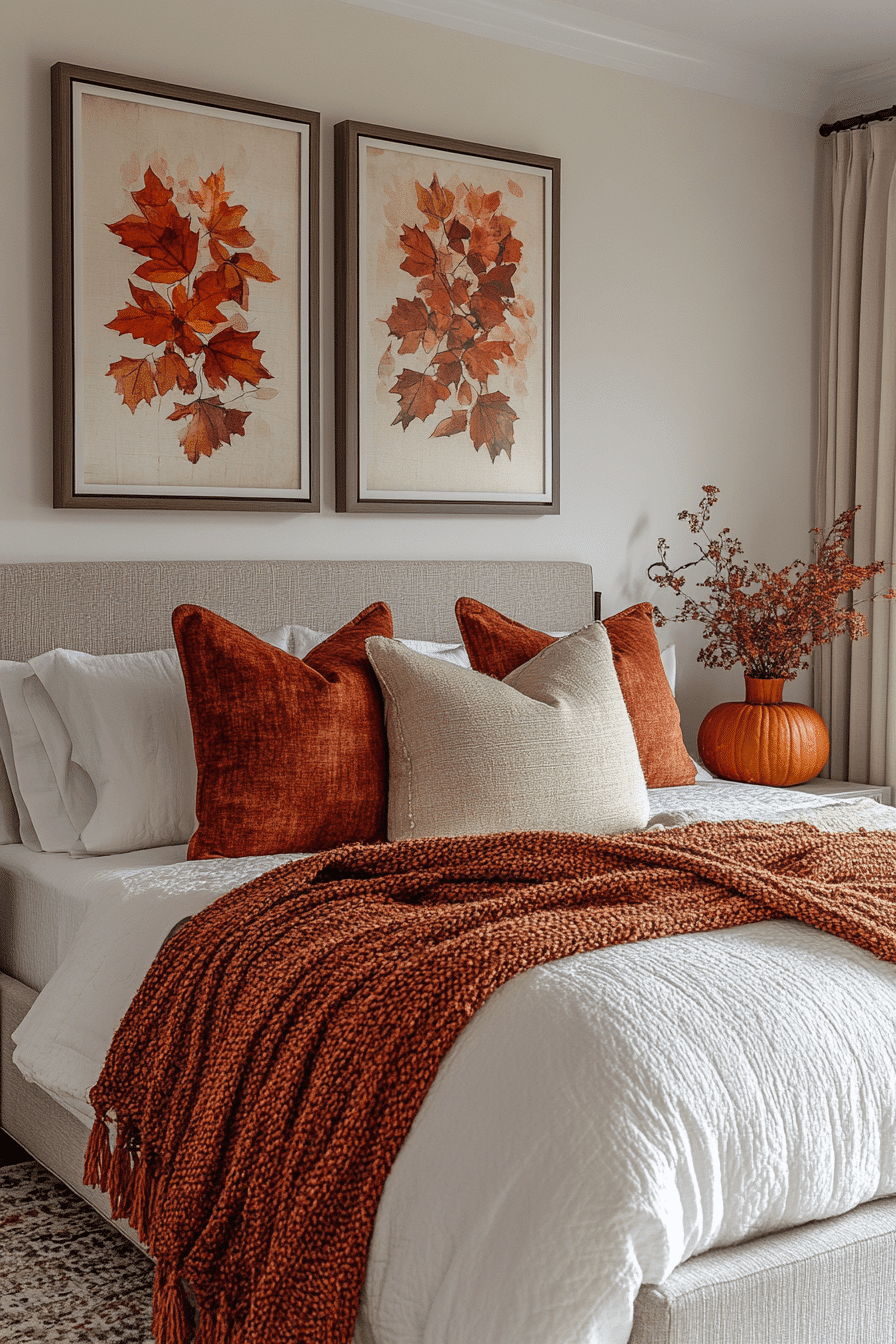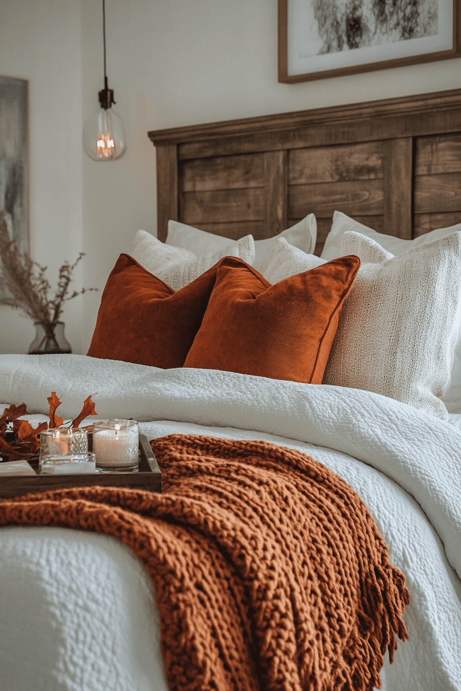 Burnt orange pillows are a vibrant addition to fall bedroom decor. Their bold color adds warmth and personality to any bed. Mix them with neutral linens to balance the brightness. The soft fabric enhances comfort while reinforcing the autumn theme. They’re a simple, budget-friendly way to refresh your space for the season. Discover more creative ways to style pillows in fall bedroom decor by clicking here!