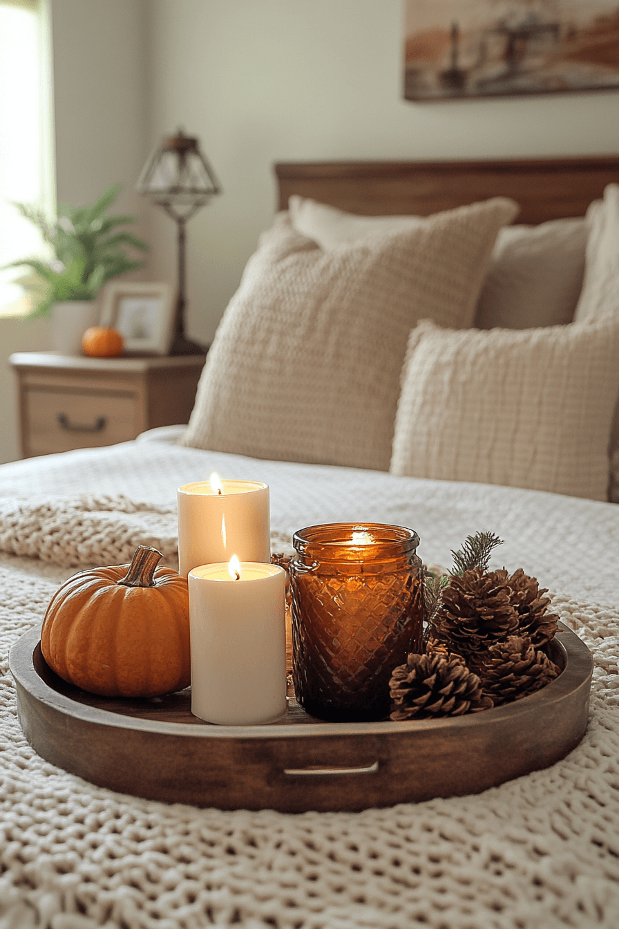 A tray of cinnamon-scented candles is a cozy must-have in fall bedroom decor. The warm aroma makes the room instantly inviting. Candles arranged on a wooden tray create stylish balance. Adding small pumpkins or pinecones elevates the seasonal theme. This setup is both functional and decorative. Click here for more candle tray styling in fall bedroom decor!