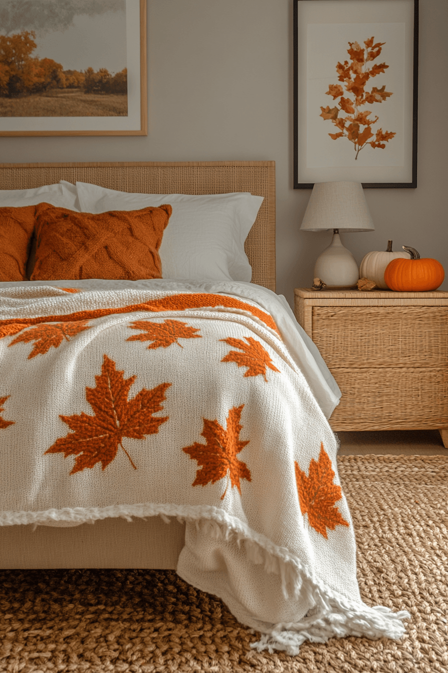 A throw blanket with maple leaf designs is perfect for fall bedroom decor. It brings seasonal charm and coziness to your bed. Bold leaf patterns stand out while keeping the look festive. Draping it over the bed or chair makes styling effortless. It’s both practical and decorative. Tap here to find more creative throw ideas for fall bedroom decor!