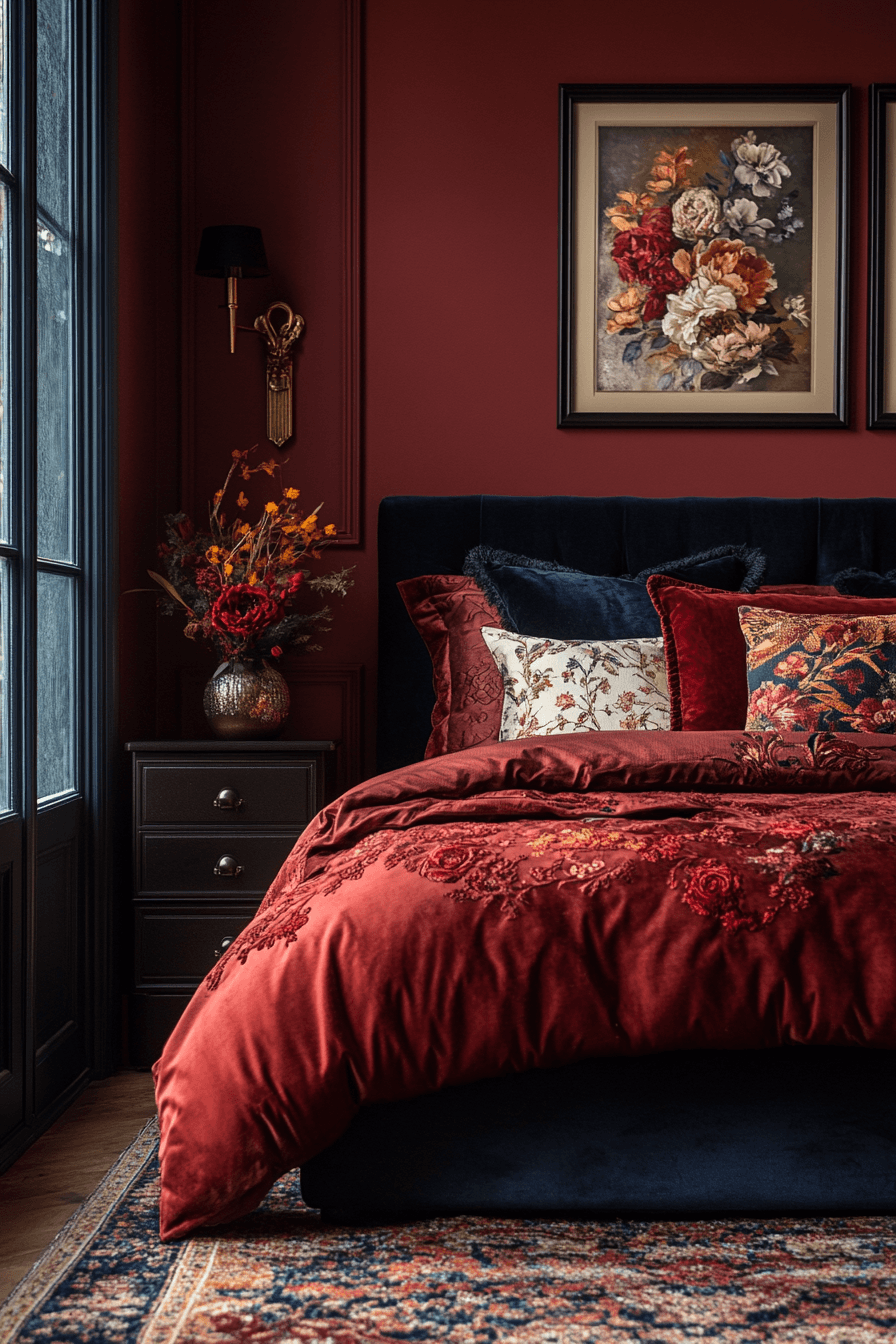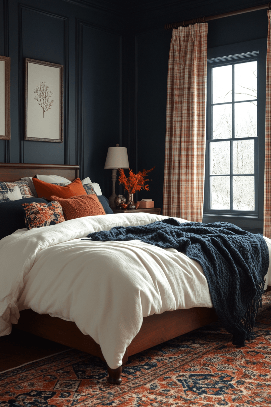 Layering moody colors like burgundy and navy creates drama in fall bedroom decor. Dark tones feel cozy and sophisticated. Adding metallic accents balances the richness. Soft textures like velvet and knit complete the look. This style feels bold yet comforting. Click here to explore more moody fall bedroom decor layers!