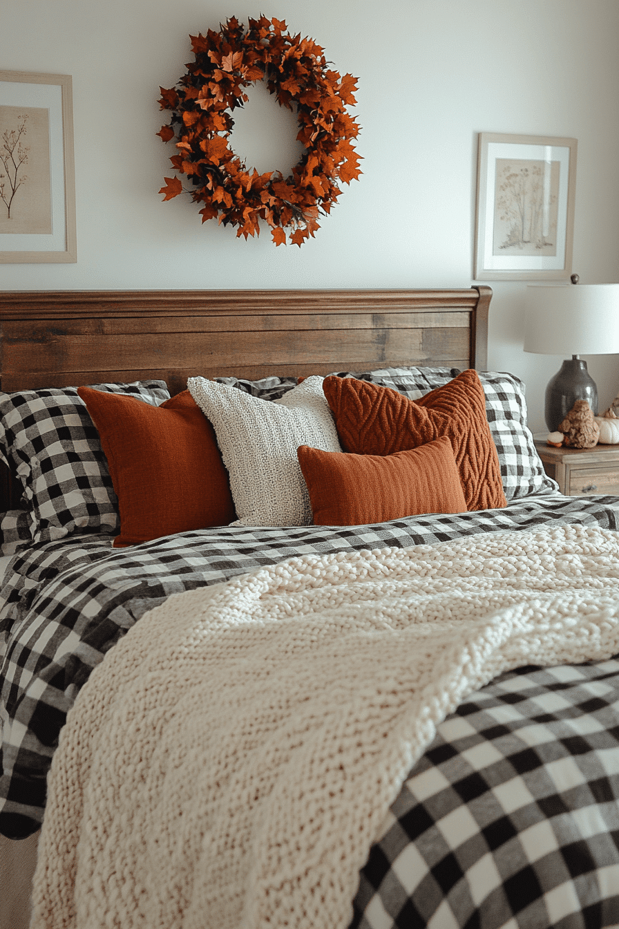 Buffalo check patterns are a classic choice for fall bedroom decor. Their bold black-and-white design feels rustic yet timeless. Paired with pumpkins or wooden accents, it completes a farmhouse vibe. This look works beautifully in both cozy cabins and modern homes. It instantly transforms your bed into a seasonal statement piece. Discover more plaid-inspired fall bedroom decor by clicking here!