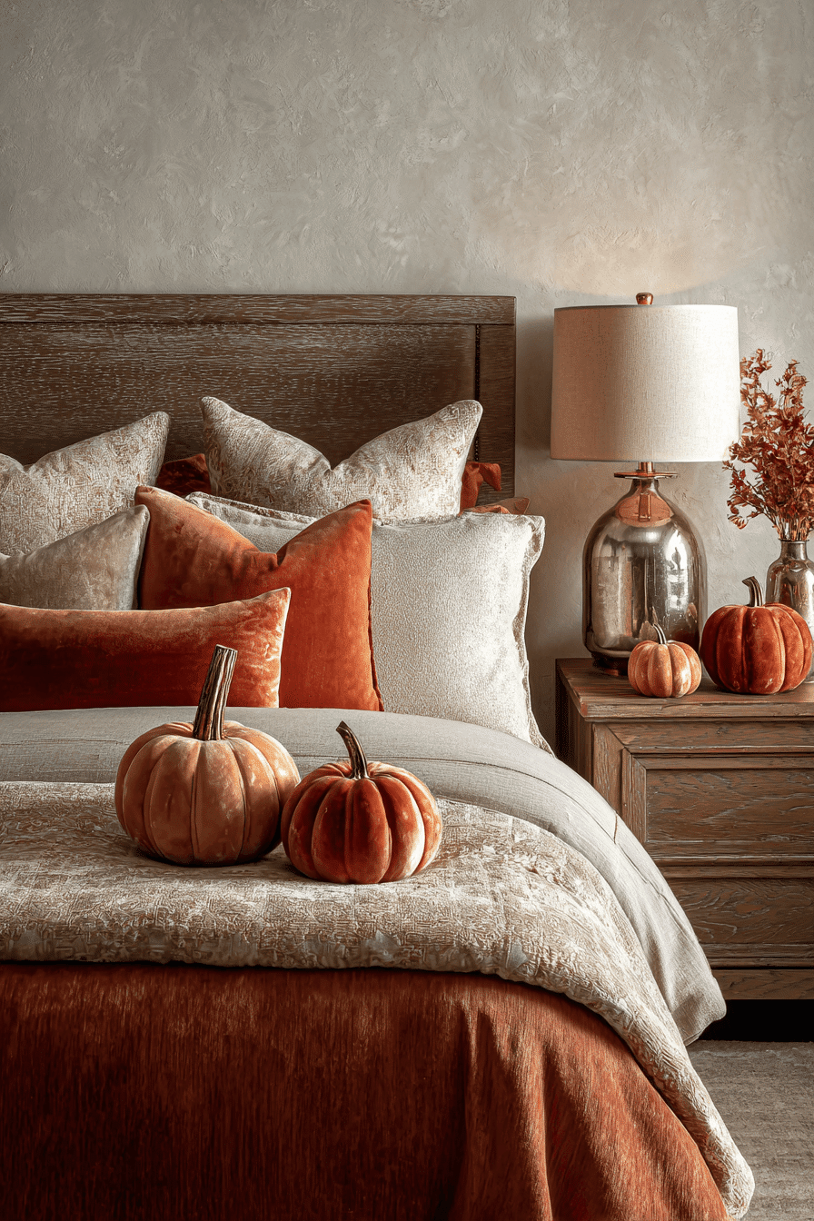 Velvet pumpkin accents bring elegance and fun to fall bedroom decor. Their rich fabric adds a luxe touch while staying playful. Arrange them on the bed, shelves, or nightstand for seasonal flair. They pair well with both neutral and bold color schemes. The mix of texture and color makes your room feel festive yet stylish. Tap now to explore more velvet-inspired fall bedroom decor ideas!