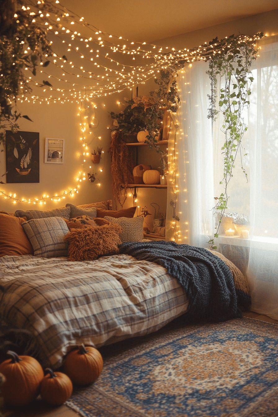 String lights draped above the bed create a magical glow in fall bedroom decor. Their soft light adds warmth to cool autumn nights. Layering them with garlands or sheer fabric enhances the effect. The cozy ambiance is perfect for reading, relaxing, or simply enjoying the season. This touch makes your bedroom feel dreamy and inviting. Click here to explore even more string light fall bedroom decor inspiration!