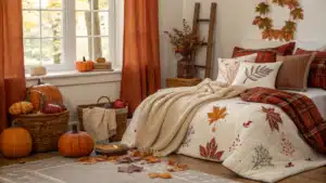 Cabin-style bedding adds rustic charm to fall bedroom decor. Plaid, flannel, and earthy tones capture the feel of a woodland retreat. Layering these elements creates a cozy, inviting atmosphere. The look is perfect for both modern and traditional bedrooms. It’s a timeless way to embrace the season. Click here to explore more cabin-inspired fall bedroom decor ideas!