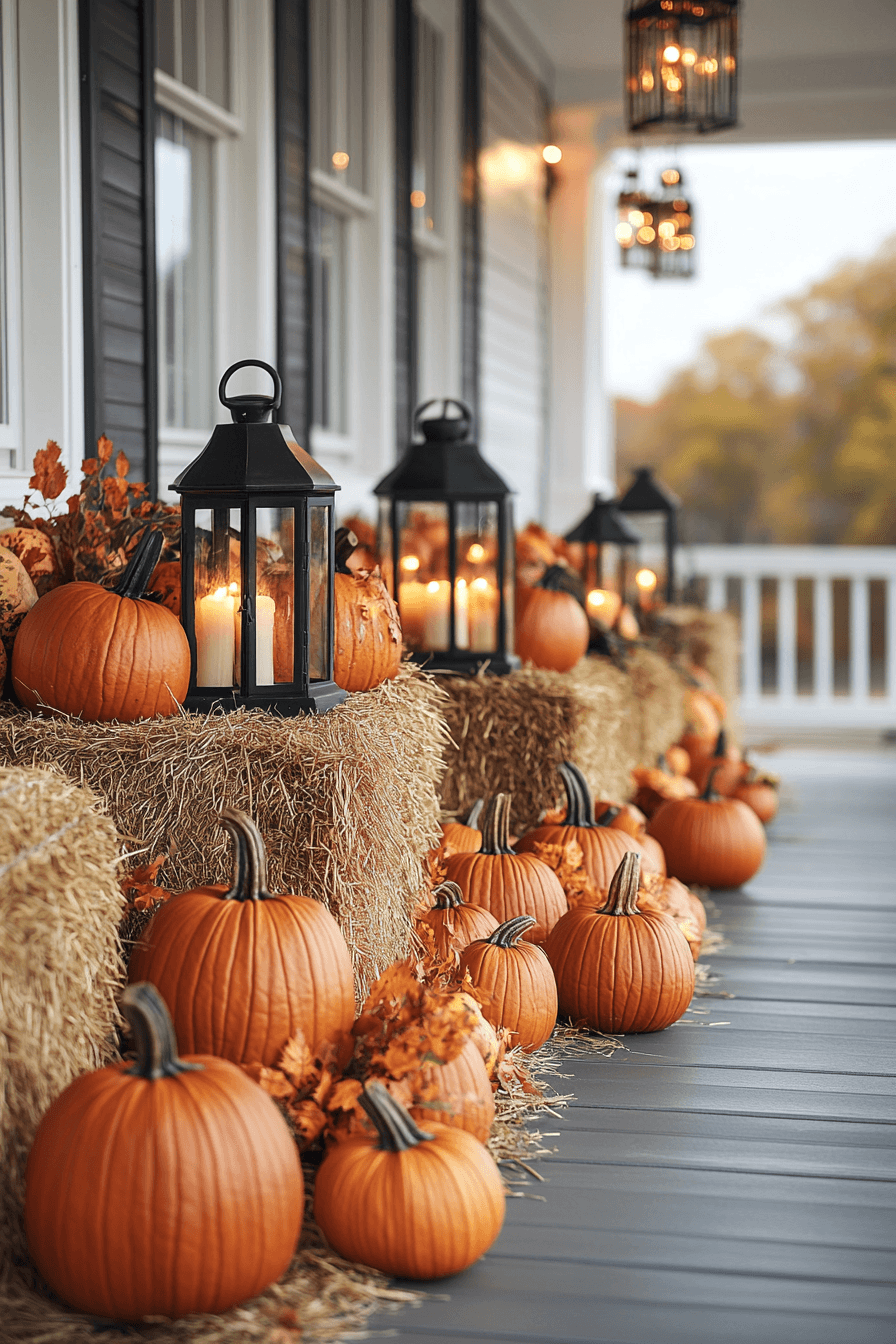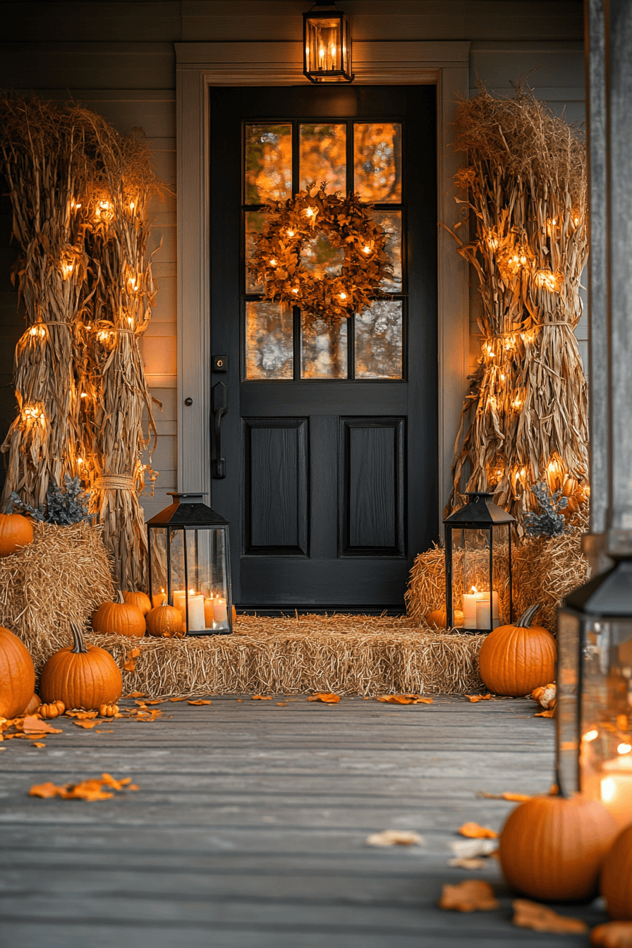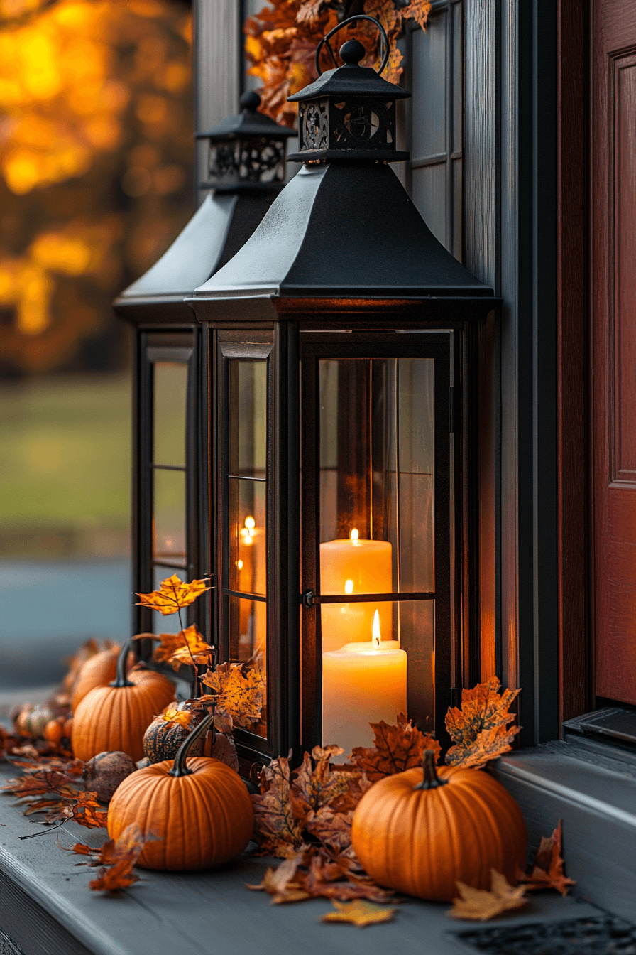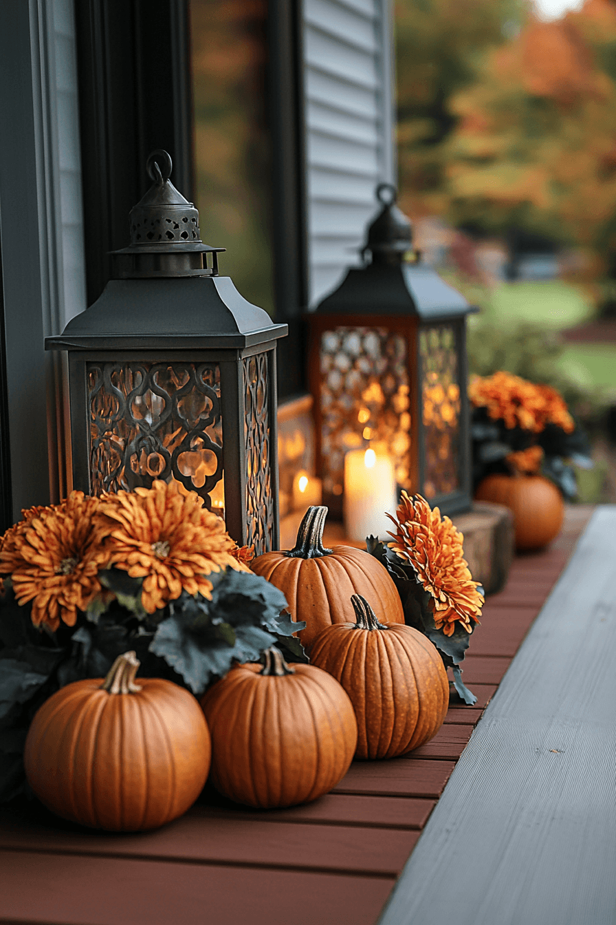 Lantern Glow highlights the magic of lighting in fall front porch decor. Lanterns filled with candles or fairy lights add ambiance day and night. Pair them with pumpkins and rustic wood accents for balance. The soft glow makes your porch cozy and inviting. This design is perfect for evenings with family or friends. Click here to explore more lantern glow porch ideas!