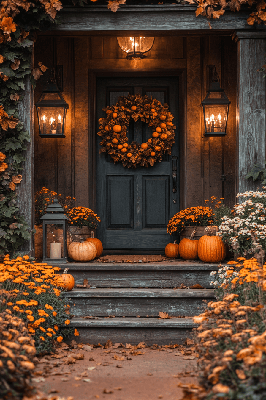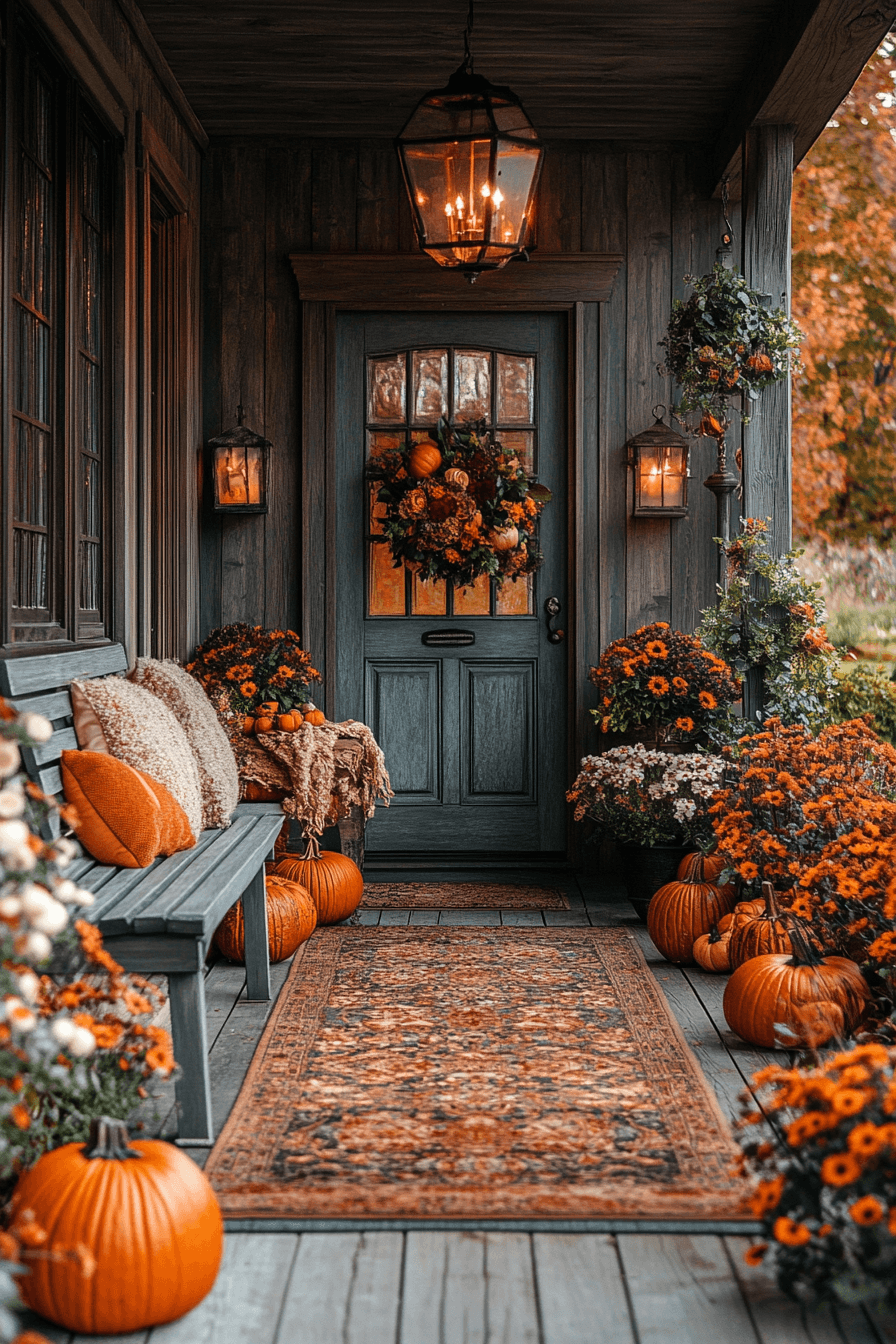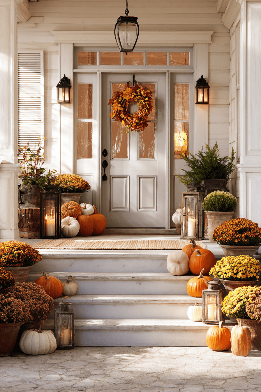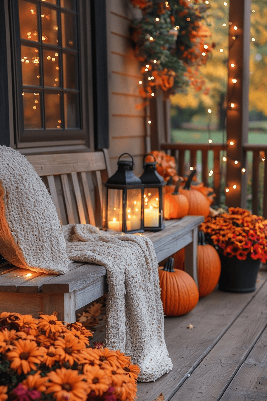Lantern Glow highlights the magic of lighting in fall front porch decor. Lanterns filled with candles or fairy lights add ambiance day and night. Pair them with pumpkins and rustic wood accents for balance. The soft glow makes your porch cozy and inviting. This design is perfect for evenings with family or friends. Click here to explore more lantern glow porch ideas!