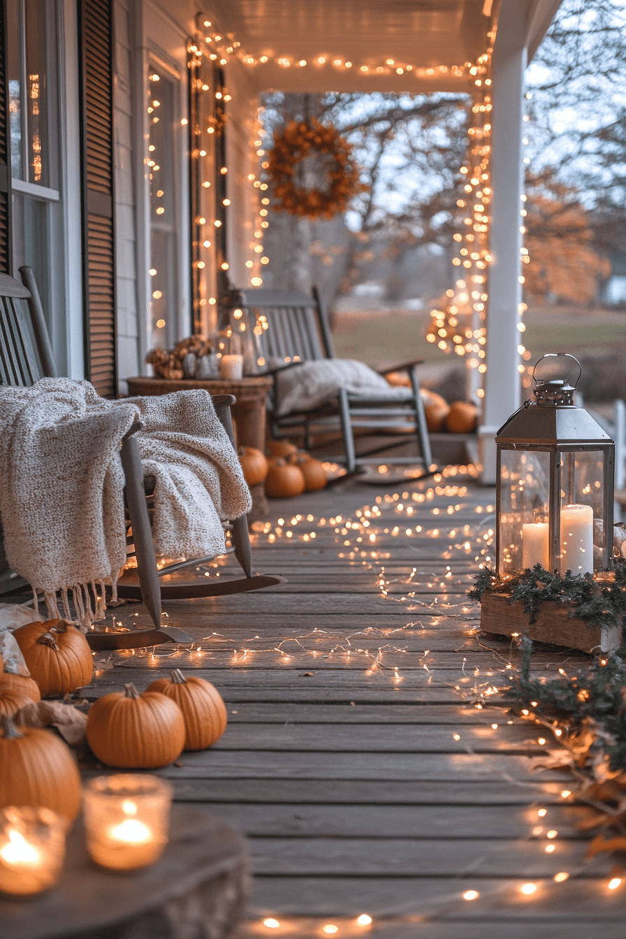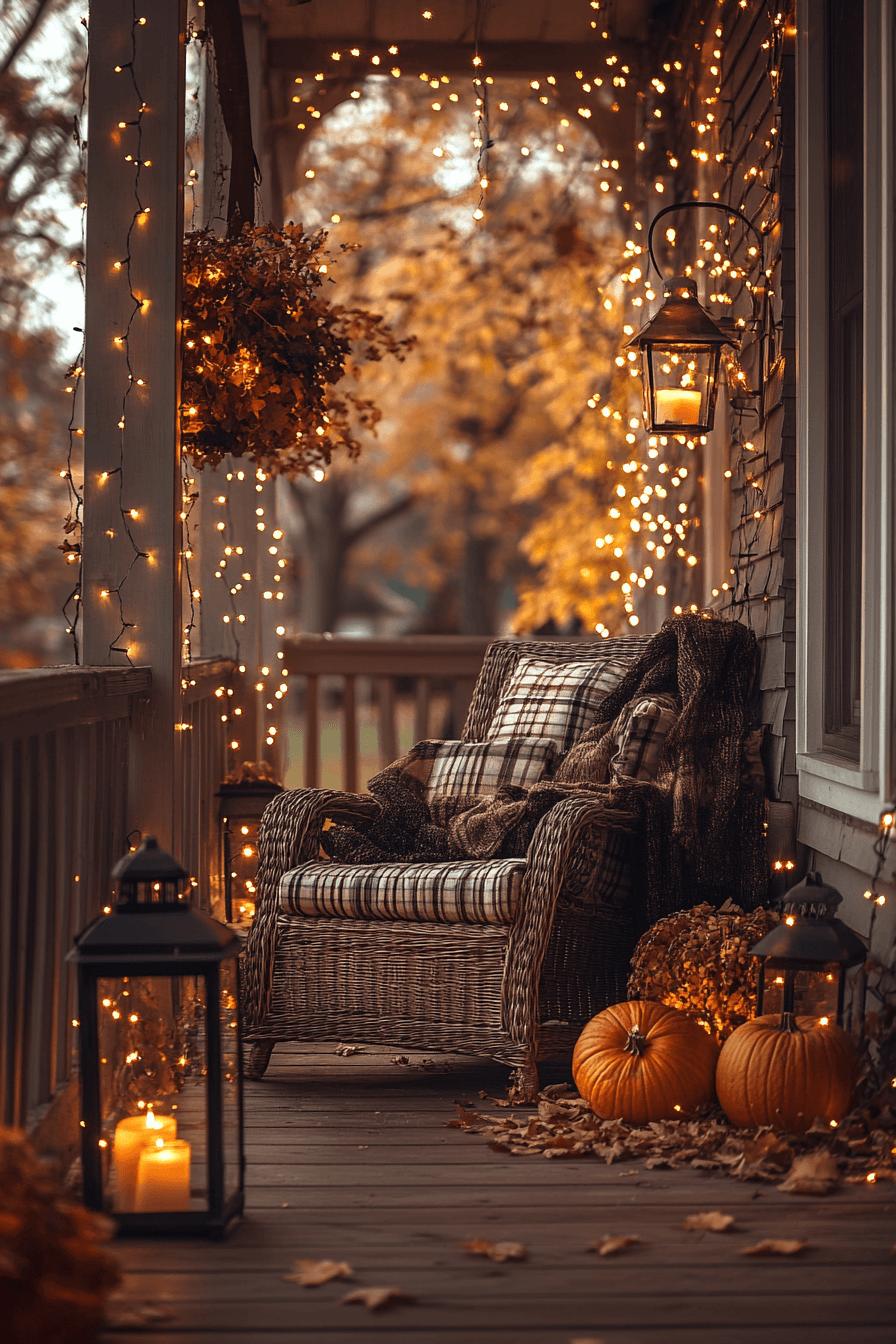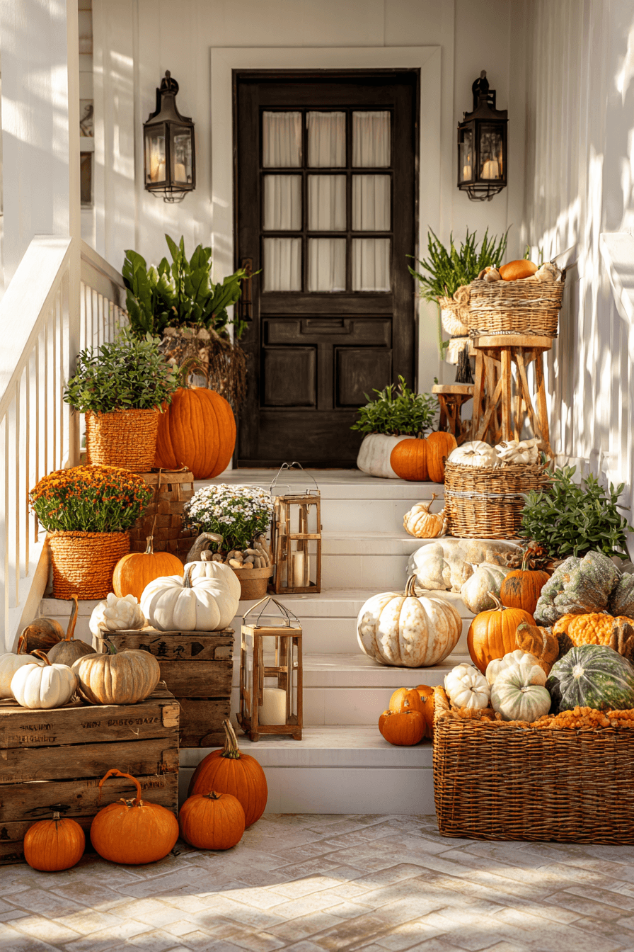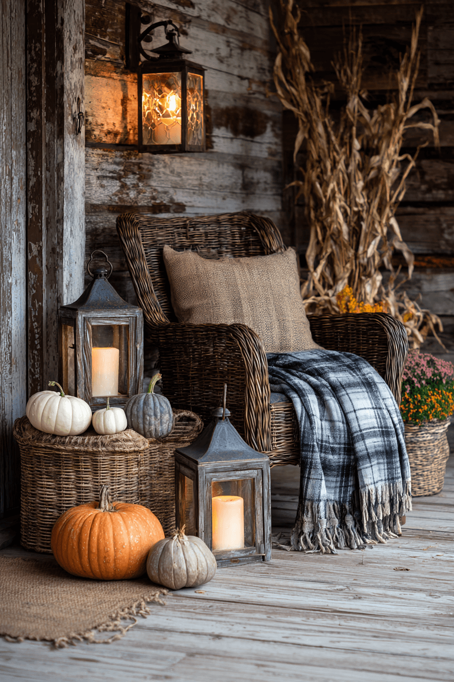 Lantern Glow highlights the magic of lighting in fall front porch decor. Lanterns filled with candles or fairy lights add ambiance day and night. Pair them with pumpkins and rustic wood accents for balance. The soft glow makes your porch cozy and inviting. This design is perfect for evenings with family or friends. Click here to explore more lantern glow porch ideas!