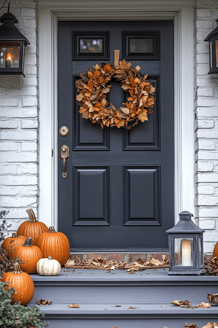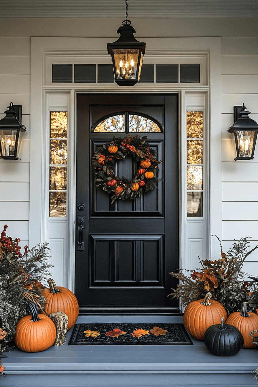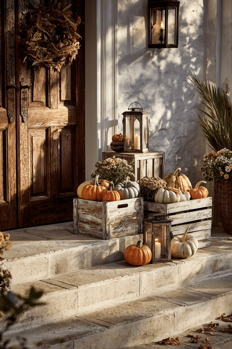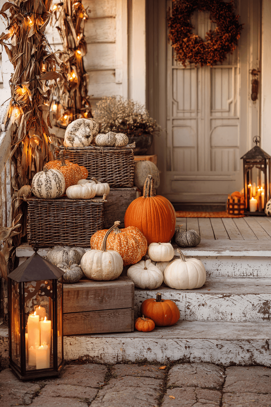 Lantern Glow highlights the magic of lighting in fall front porch decor. Lanterns filled with candles or fairy lights add ambiance day and night. Pair them with pumpkins and rustic wood accents for balance. The soft glow makes your porch cozy and inviting. This design is perfect for evenings with family or friends. Click here to explore more lantern glow porch ideas!