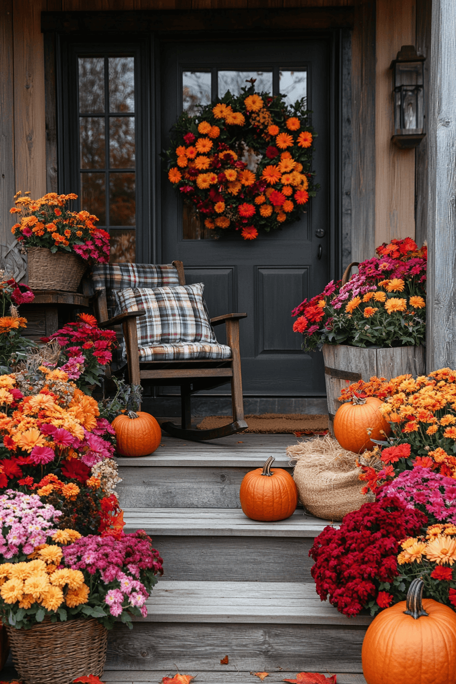 Fall Florals infuse fresh seasonal color into fall front porch decor. Mums, marigolds, and asters create a lively display. Pairing flowers with rustic baskets adds charm and texture. Their bright hues bring life to cooler days. This style feels cheerful and welcoming for visitors. Click now to get inspired by even more floral porch ideas!