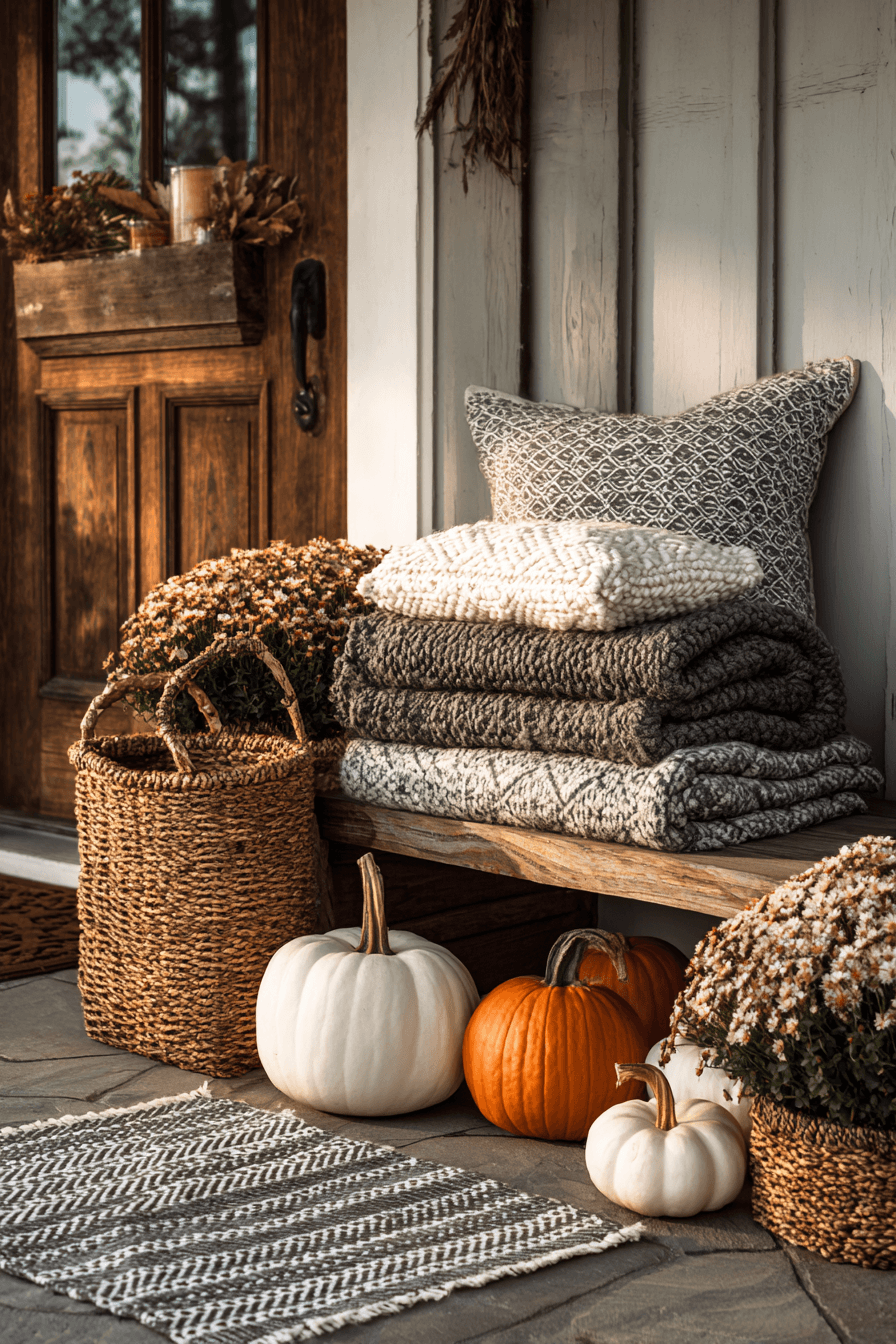 Autumn Layers emphasizes texture and depth in fall front porch decor. Combine blankets, rugs, and pillows with pumpkins and florals. The mix makes your porch feel cozy and lived-in. Layers also create a polished, styled appearance. It’s perfect for adding comfort to your seasonal design. Tap here to discover more layered porch inspiration!