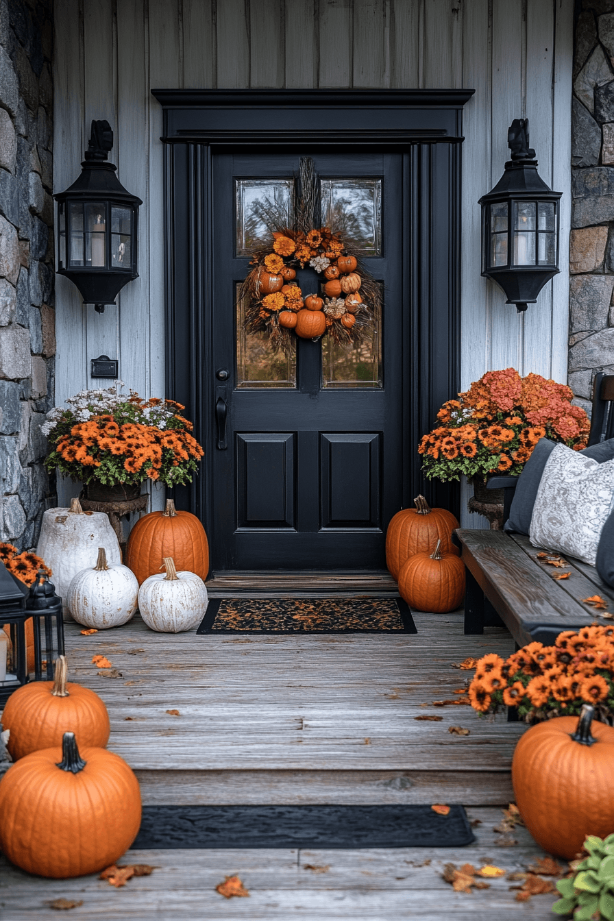 Autumn Gathering celebrates togetherness through fall front porch decor. Add benches, lanterns, and cozy throws for a communal feel. Pumpkins and seasonal florals enhance the warmth. This look is inviting for both guests and family. It highlights the joy of spending time outdoors. Tap here to discover more autumn gathering porch setups!