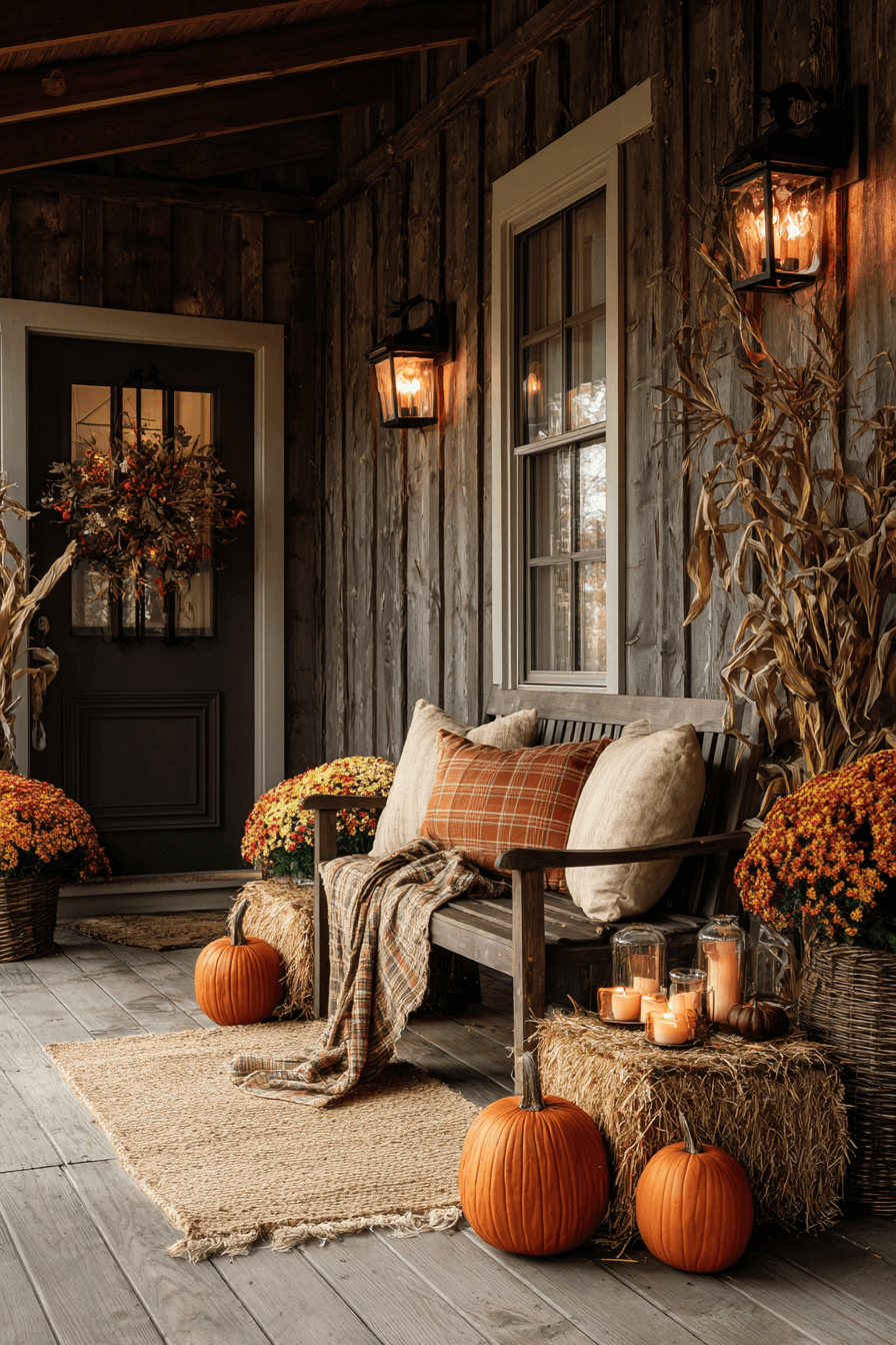 Harvest Warmth captures the golden tones of autumn in fall front porch decor. Layering hay bales, cornstalks, and pumpkins creates a seasonal harvest feel. A cozy seating area with plaid throws ties everything together. This look radiates comfort and a sense of togetherness. It’s ideal for both everyday living and festive gatherings. Tap here to find more harvest porch inspiration today!