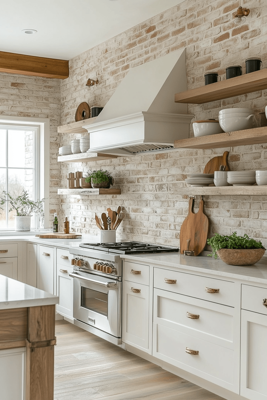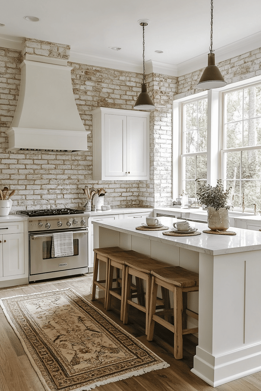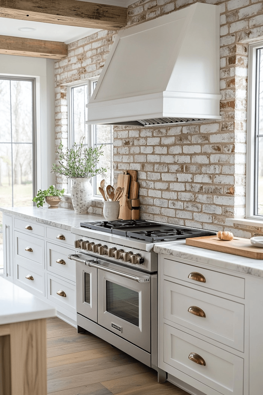 White brick delivers a chic yet cozy twist on farmhouse living. A farmhouse kitchen brick backsplash in bright white brings freshness, elevating the kitchen with a timeless appeal. The reflective quality of white makes even small kitchens feel spacious and airy. Paired with wood or metal accents, the look feels both grounded and sophisticated. White brick is also endlessly adaptable, whether your style leans rustic or contemporary. Tap here to discover more elegant white brick farmhouse kitchens!