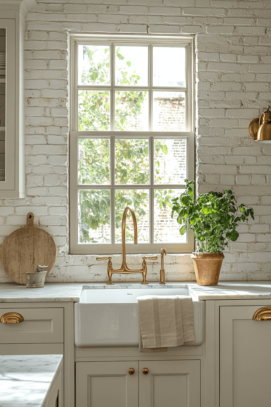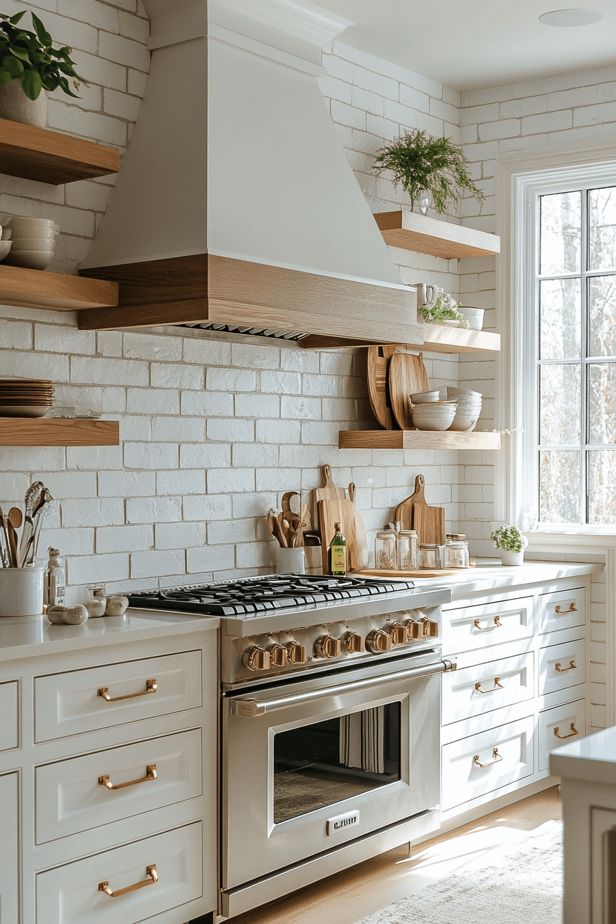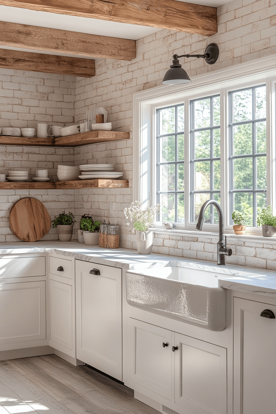 White brick delivers a chic yet cozy twist on farmhouse living. A farmhouse kitchen brick backsplash in bright white brings freshness, elevating the kitchen with a timeless appeal. The reflective quality of white makes even small kitchens feel spacious and airy. Paired with wood or metal accents, the look feels both grounded and sophisticated. White brick is also endlessly adaptable, whether your style leans rustic or contemporary. Tap here to discover more elegant white brick farmhouse kitchens!