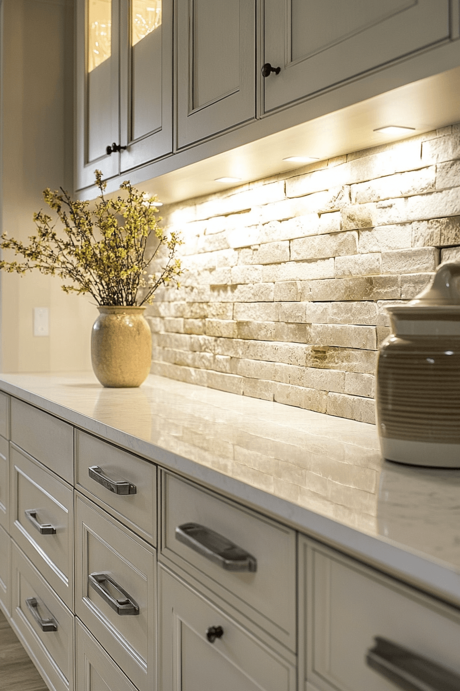 Adding texture is one of the easiest ways to elevate a space. A farmhouse kitchen brick backsplash makes the wall feel alive with detail. Each brick adds charm, depth, and authenticity. It becomes a feature you’ll admire daily, even without extra décor. This pop of texture is what gives farmhouse kitchens their signature style. Tap here to explore more textured backsplash ideas!