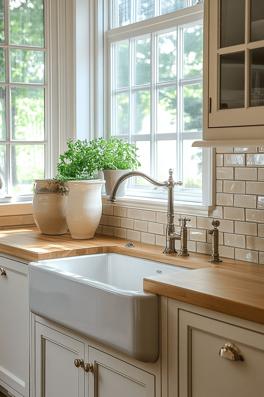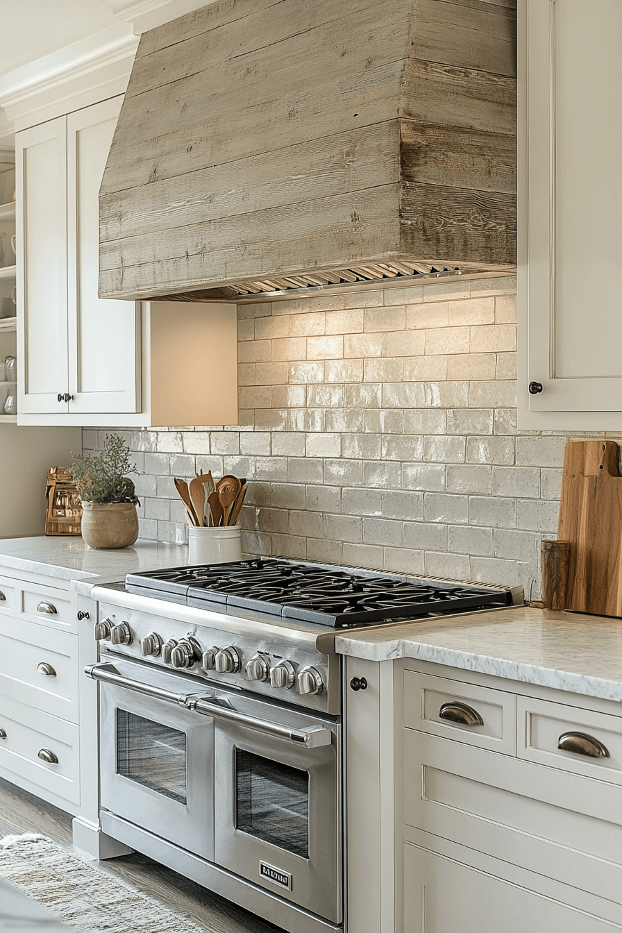 Minimal doesn’t mean boring when it comes to farmhouse kitchens. A farmhouse kitchen brick backsplash in understated tones creates a clean yet textured backdrop. Its subtle look highlights the beauty of other design details. This approach lets your space breathe while keeping the farmhouse charm intact. Perfect for those who prefer less clutter but plenty of style. Click here to uncover more minimal farmhouse backsplash inspirations!
