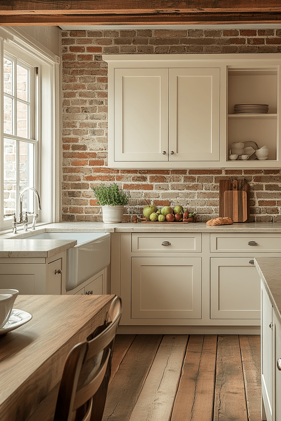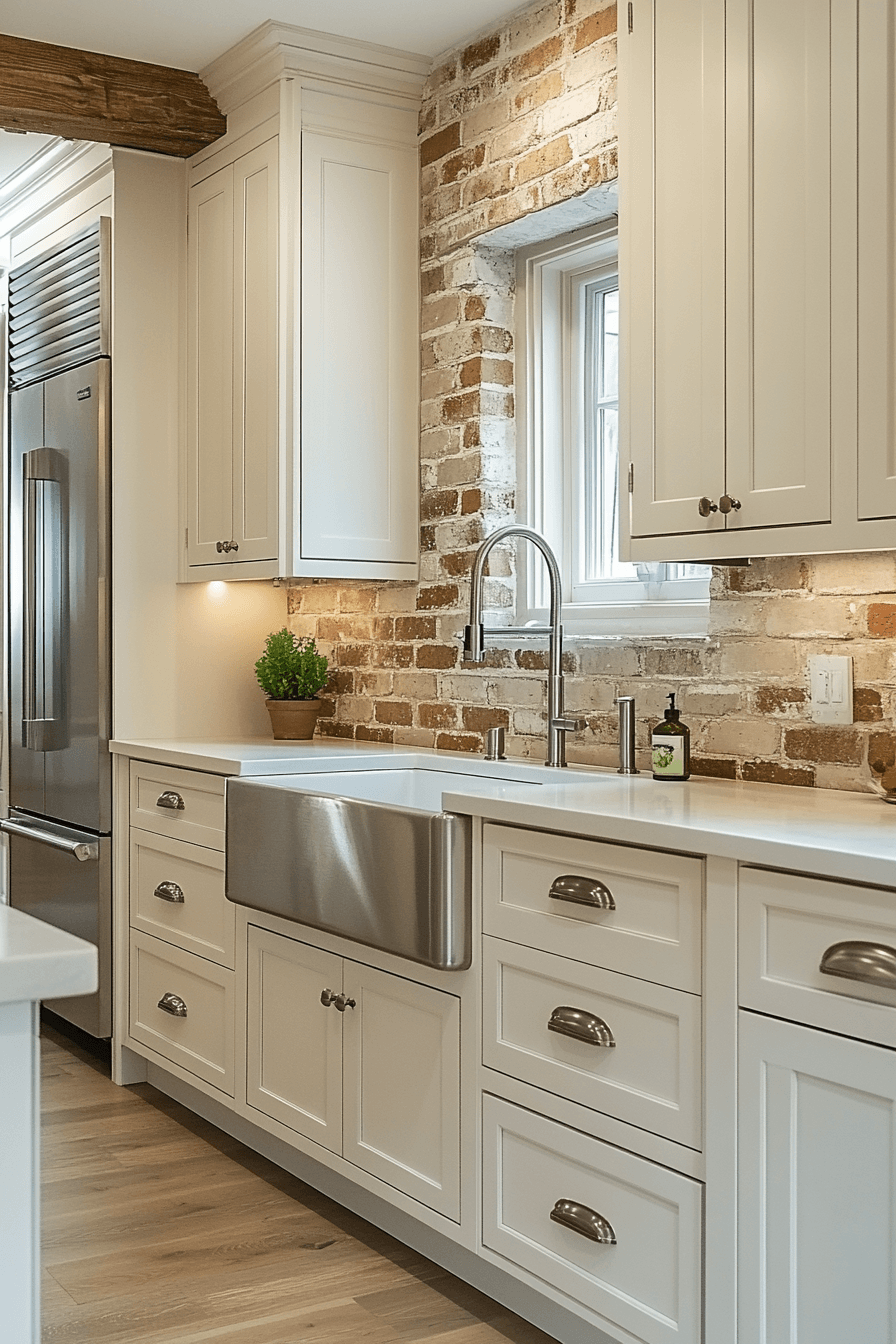 Subtle design choices can transform a kitchen into a sanctuary. A farmhouse kitchen brick backsplash with muted tones keeps the focus on warmth and simplicity. Its gentle texture adds depth without being too bold. This look is perfect for those who love understated elegance. It feels peaceful yet stylish, offering long-lasting appeal. Tap here to explore more subtle farmhouse brick ideas!