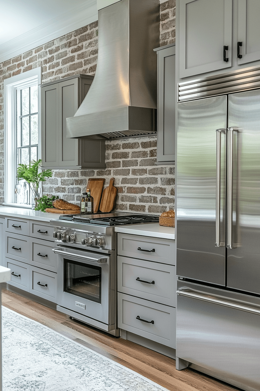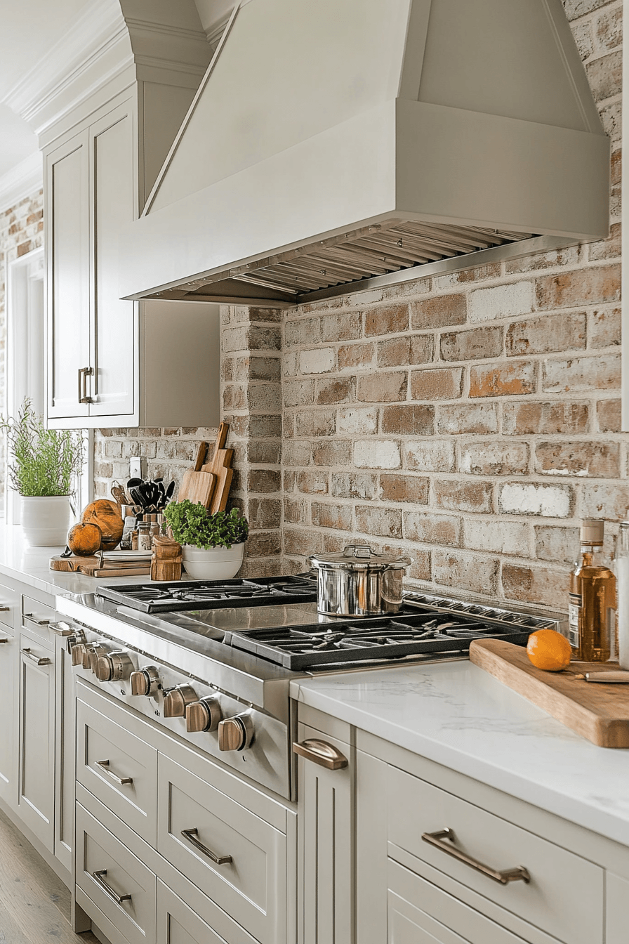 Pale brick tones can completely change the atmosphere of a room. A farmhouse kitchen brick backsplash in light beige or gray opens up the space, creating a breezy vibe. The subtle texture ensures it doesn’t overwhelm the design. Light brick complements farmhouse kitchens with airy palettes, keeping things cohesive and stylish. This look works especially well in small kitchens that need brightness. Click here to explore more light and charming brick designs!