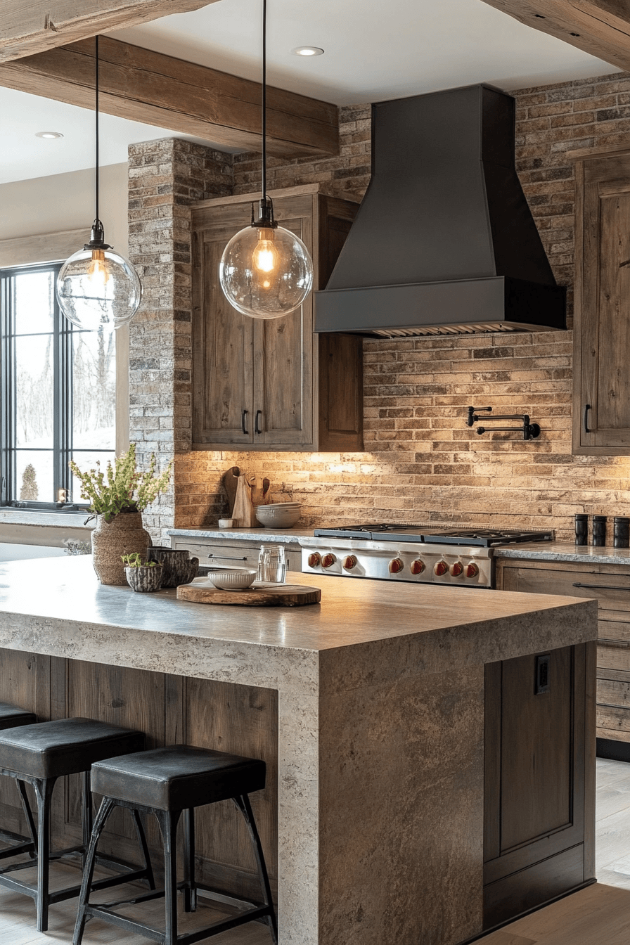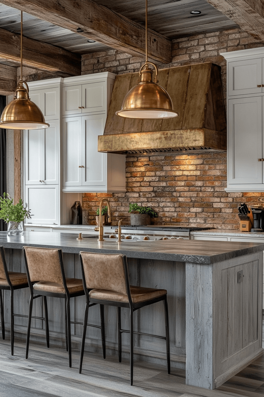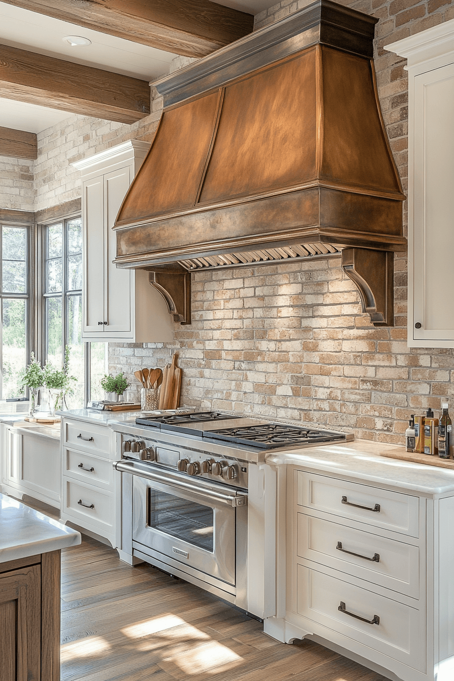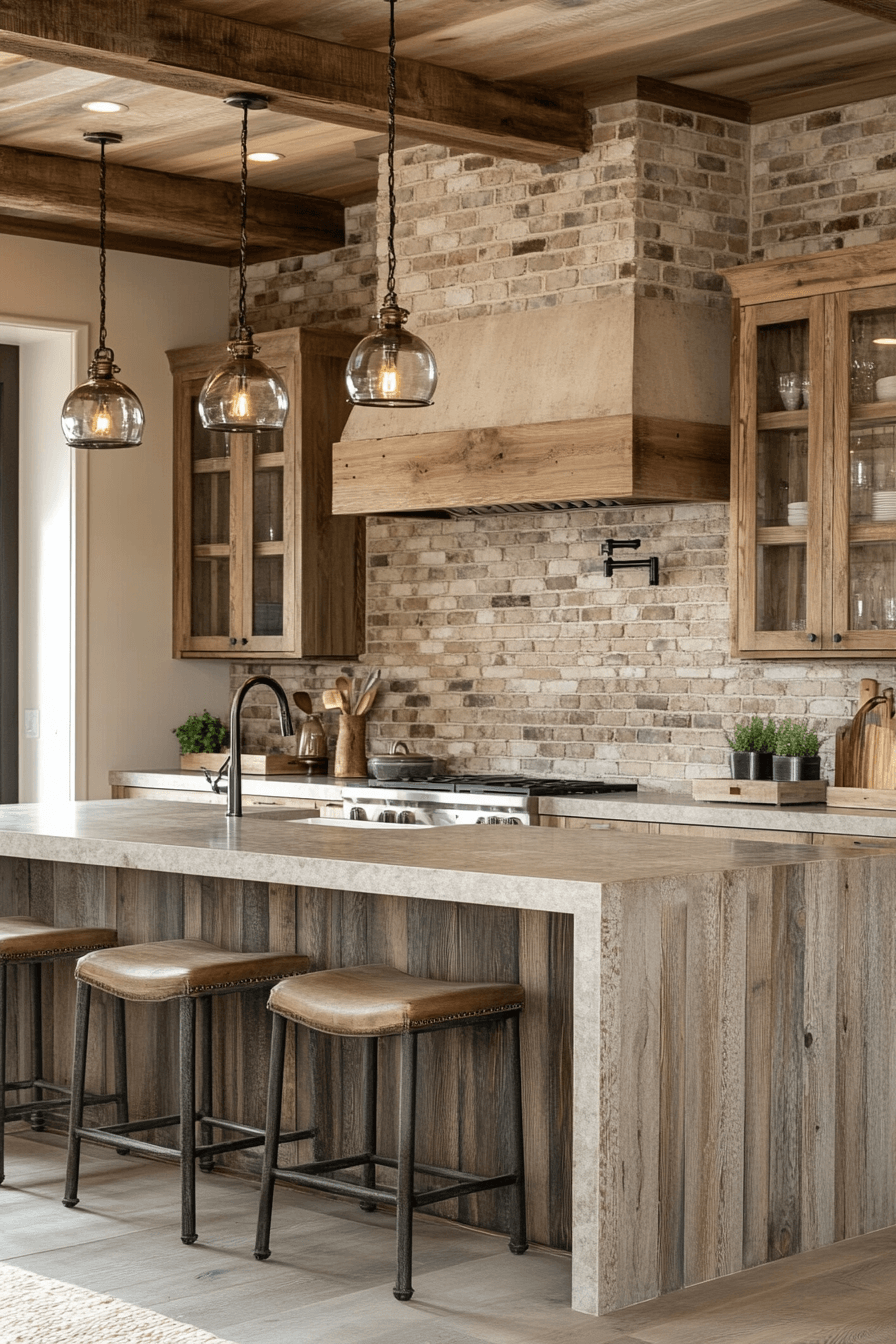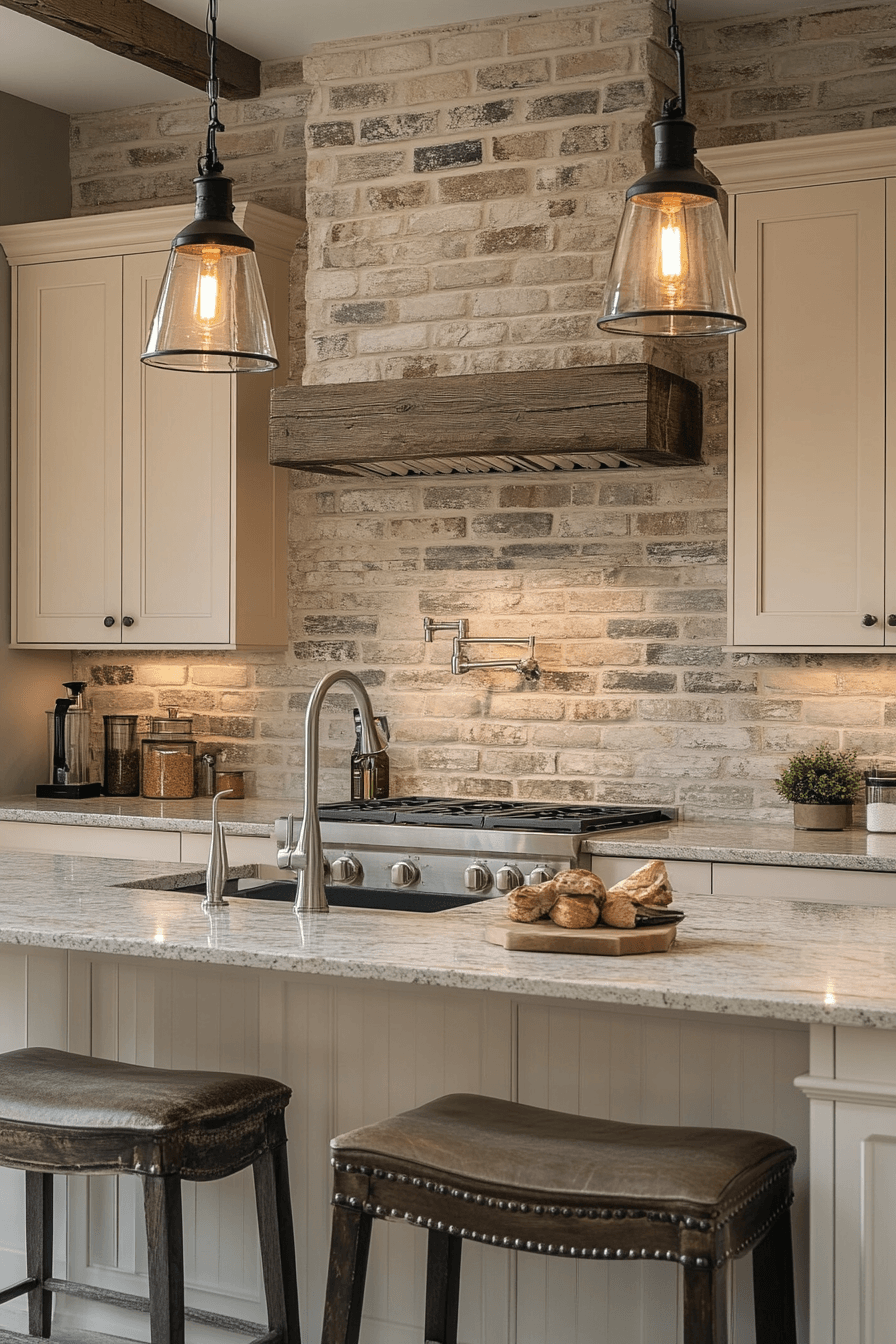 Whitewashed brick brings a sense of brightness and calm, making your farmhouse kitchen feel welcoming yet refined. The pale tones reflect light beautifully, opening up the room and highlighting every corner. With a farmhouse kitchen brick backsplash in this style, you get a perfect balance of rustic warmth and modern freshness. It pairs well with everything from butcher block counters to sleek marble finishes, giving you total flexibility. This design also softens the boldness of traditional brick, offering a more delicate take on farmhouse charm. Tap here to explore even more dreamy whitewashed brick inspirations!
