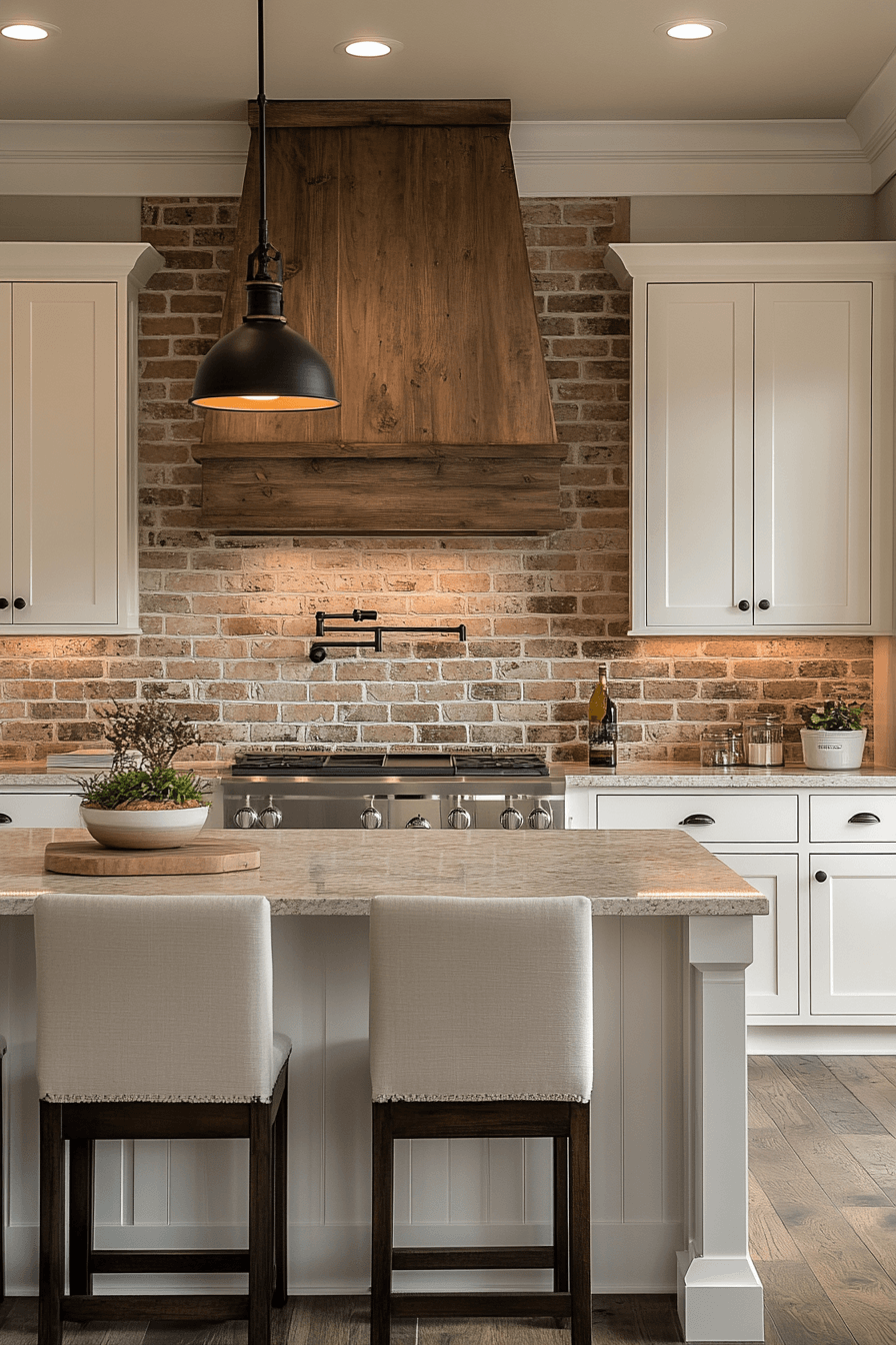 Every farmhouse kitchen deserves a touch of comfort, and brick is the perfect way to achieve it. A farmhouse kitchen brick backsplash brings warmth through earthy tones and rich textures. Its rugged yet inviting look feels like home, making it the ideal backdrop for family gatherings. Paired with rustic wood tables or bright open spaces, brick makes the kitchen a true centerpiece. This design combines practical durability with everyday charm. Click here to see more cozy brick ideas that bring heart to your kitchen!