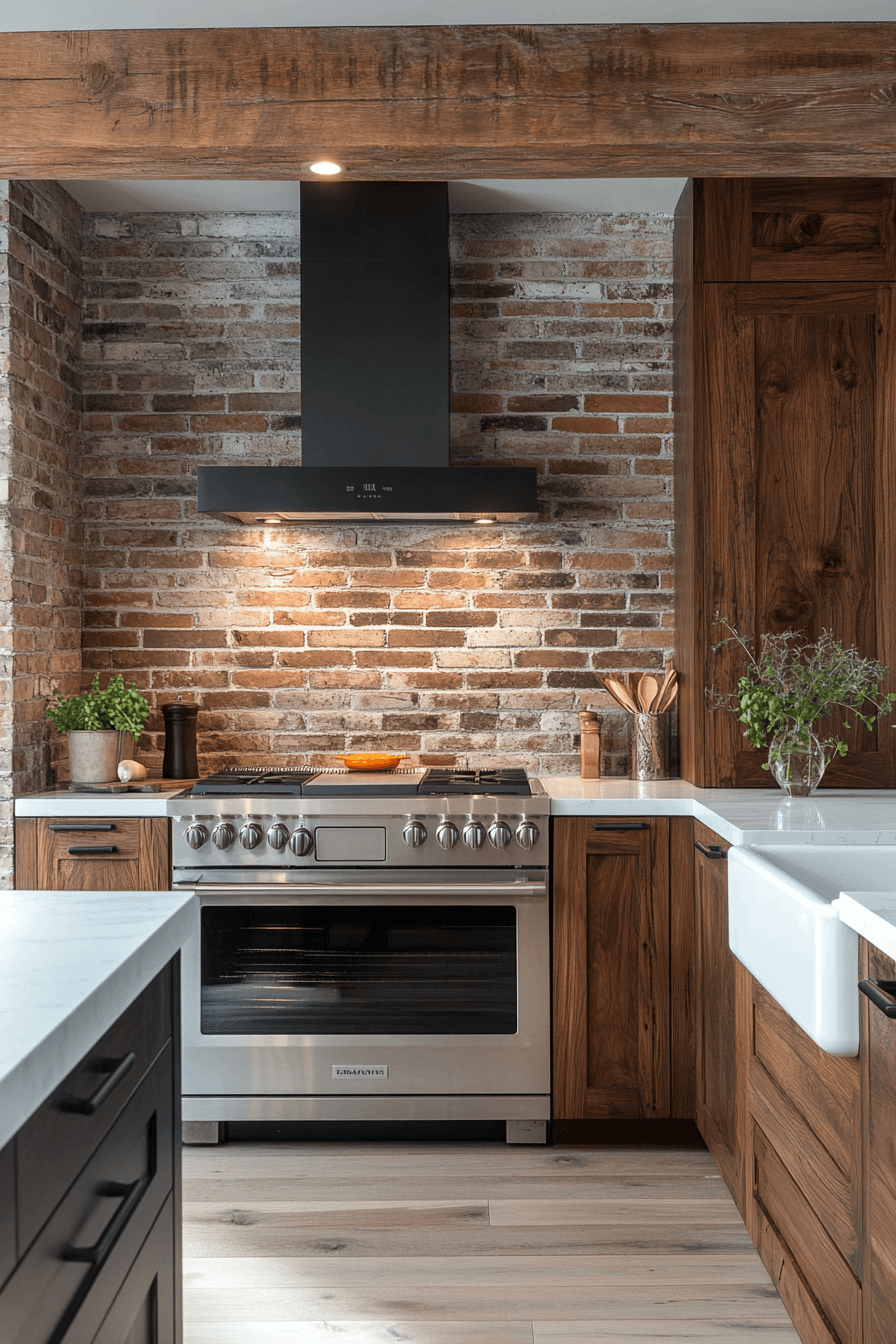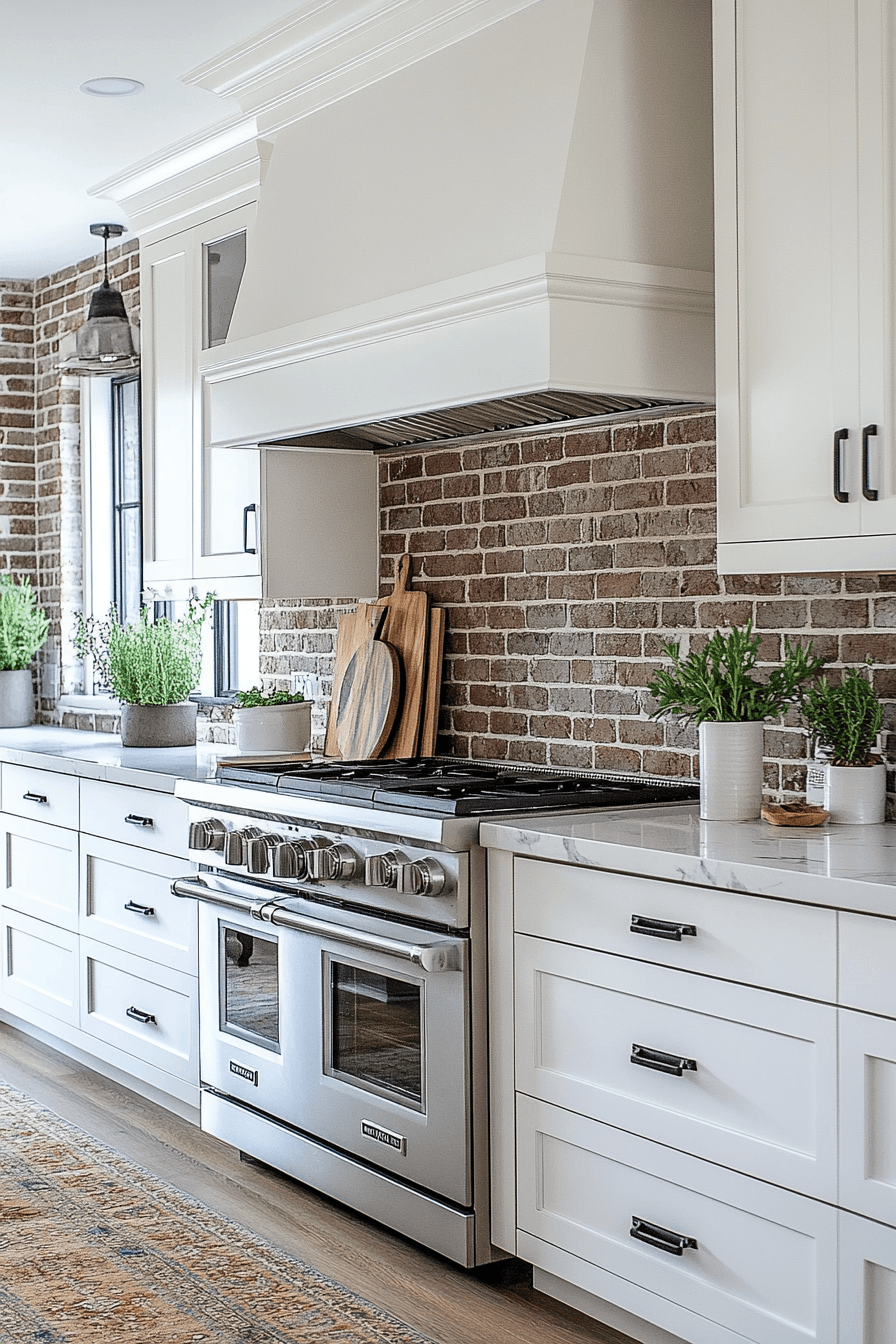 Blending rustic texture with modern sleekness, a brick accent wall can transform your kitchen into a showstopper. A farmhouse kitchen brick backsplash in lighter finishes adds crispness without losing warmth. Clean cabinetry and stainless accents bring balance, keeping the look fresh. The brick’s organic surface makes the kitchen feel more dynamic, yet easy to maintain. It’s the perfect solution if you love farmhouse style but want a contemporary edge. Tap here to explore more modern brick inspirations for your space!