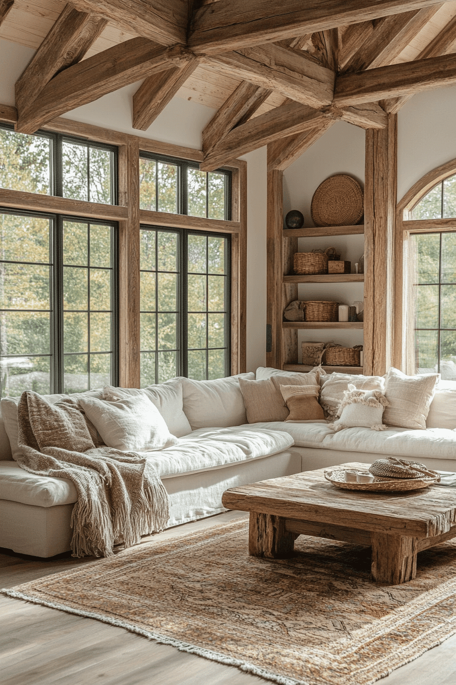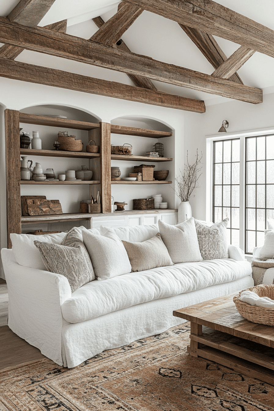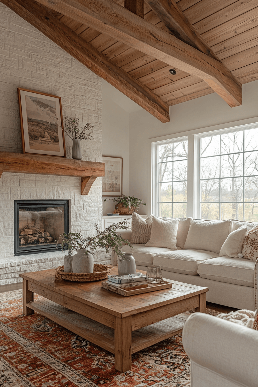 A farmhouse living room featuring raw wood accents celebrates natural textures and timeless charm. Exposed beams, rustic shelving, and handcrafted tables make the space unique and warm. Neutral furnishings keep the focus on organic materials. Layered fabrics add softness to balance the rugged wood features. This farmhouse living room design embraces nature beautifully while remaining stylish. Click here to uncover more raw wood farmhouse living room ideas.