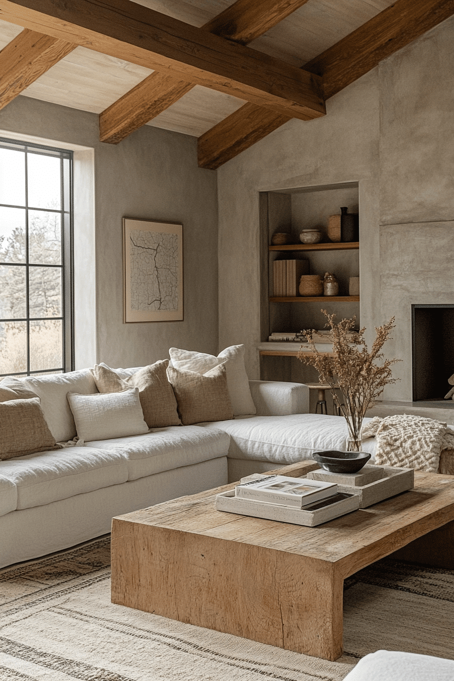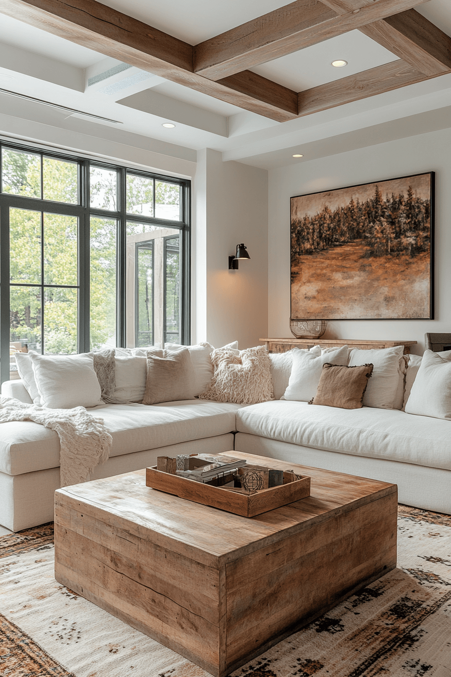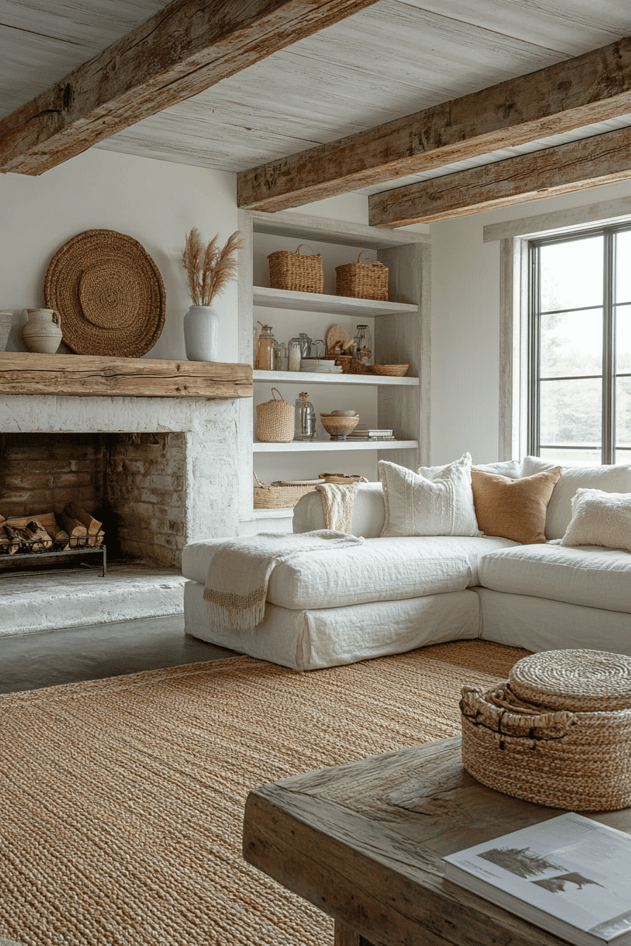 A farmhouse living room featuring raw wood accents celebrates natural textures and timeless charm. Exposed beams, rustic shelving, and handcrafted tables make the space unique and warm. Neutral furnishings keep the focus on organic materials. Layered fabrics add softness to balance the rugged wood features. This farmhouse living room design embraces nature beautifully while remaining stylish. Click here to uncover more raw wood farmhouse living room ideas.
