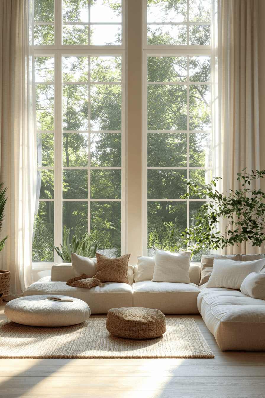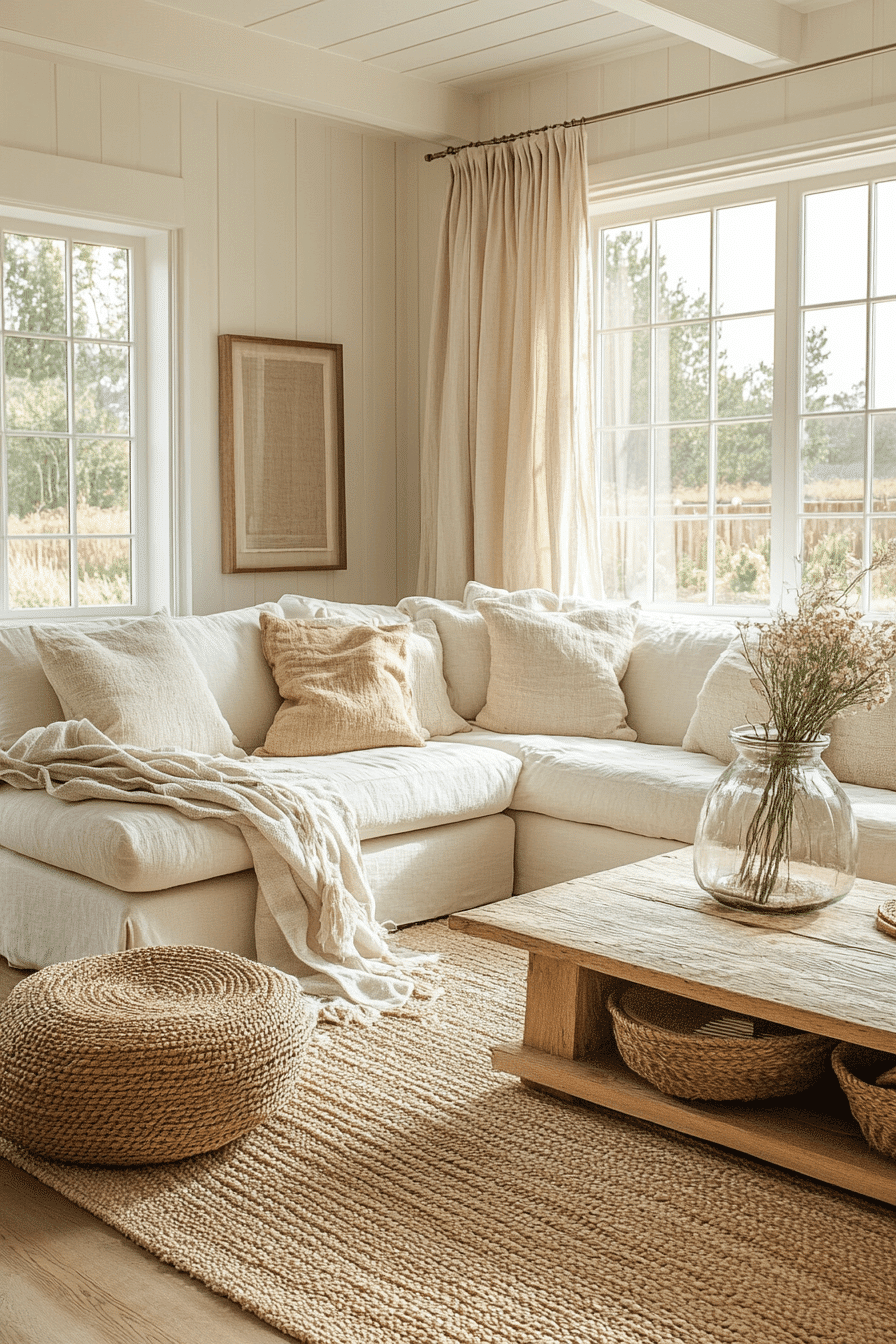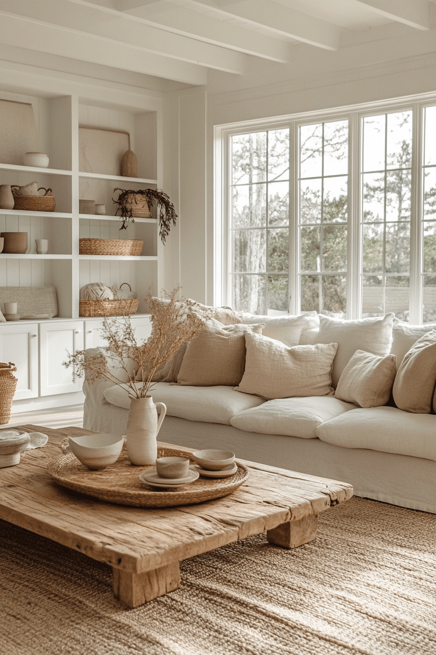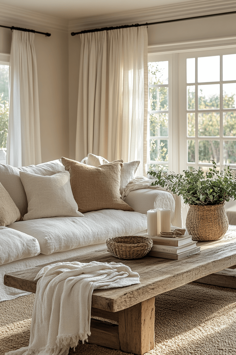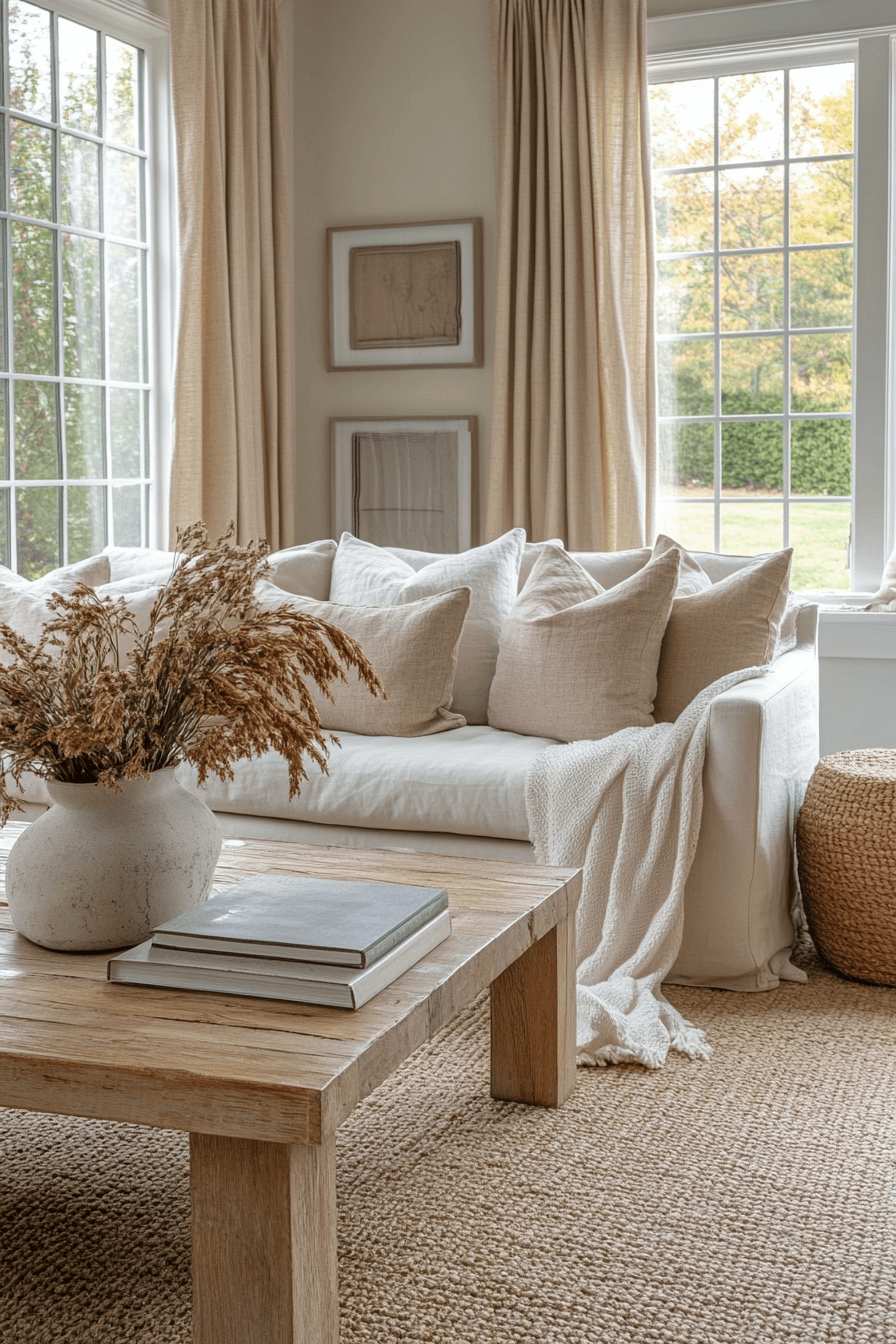 A neutral farmhouse living room focuses on calming shades of beige, cream, and soft gray for a serene environment. Textured fabrics and layered accents bring dimension without overwhelming the space. Wooden furniture grounds the design while maintaining a natural, inviting feel. Oversized windows maximize natural light, enhancing the warm, relaxing ambiance. This farmhouse living room look is perfect for creating a cozy retreat at home. Tap to explore additional neutral farmhouse ideas today.