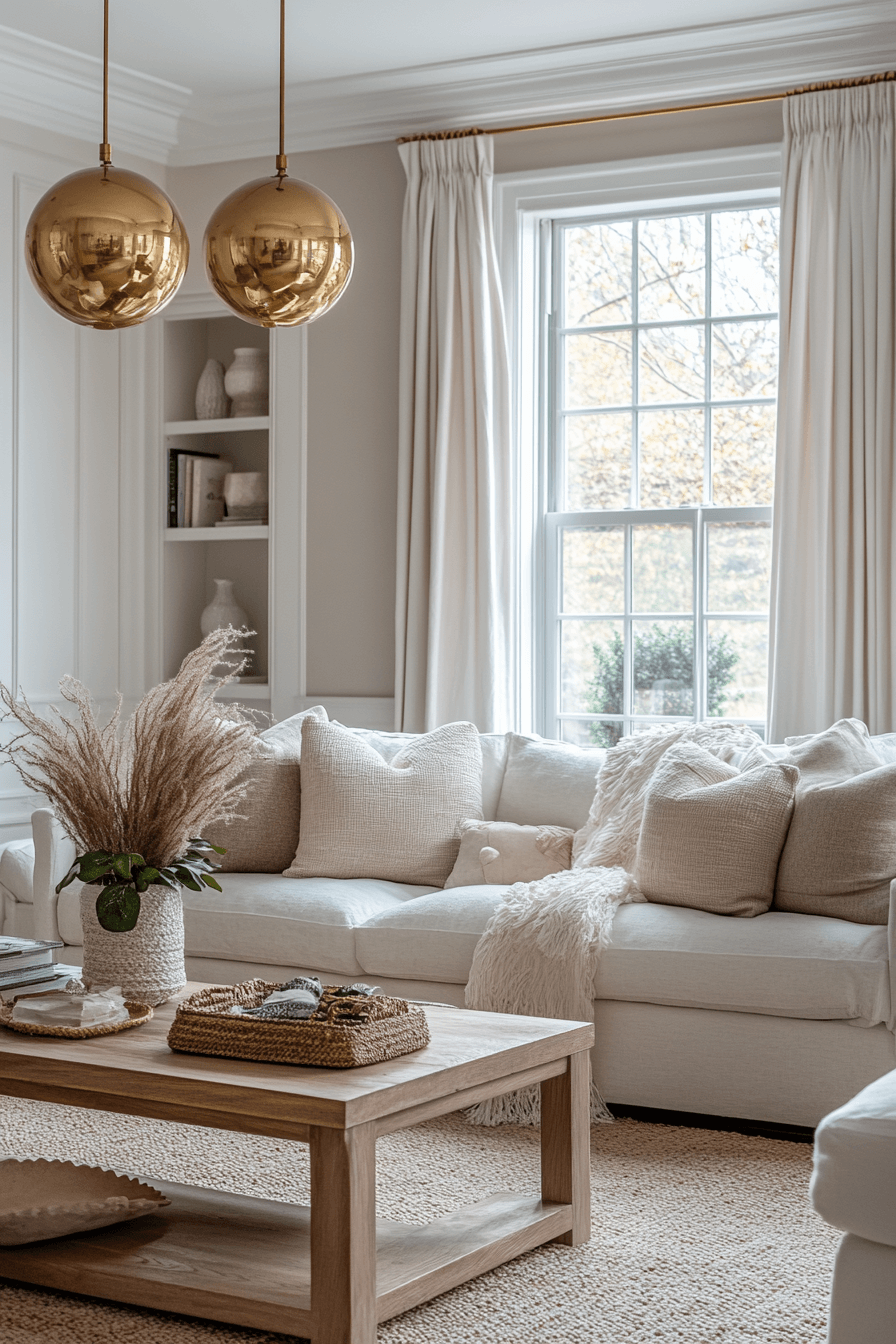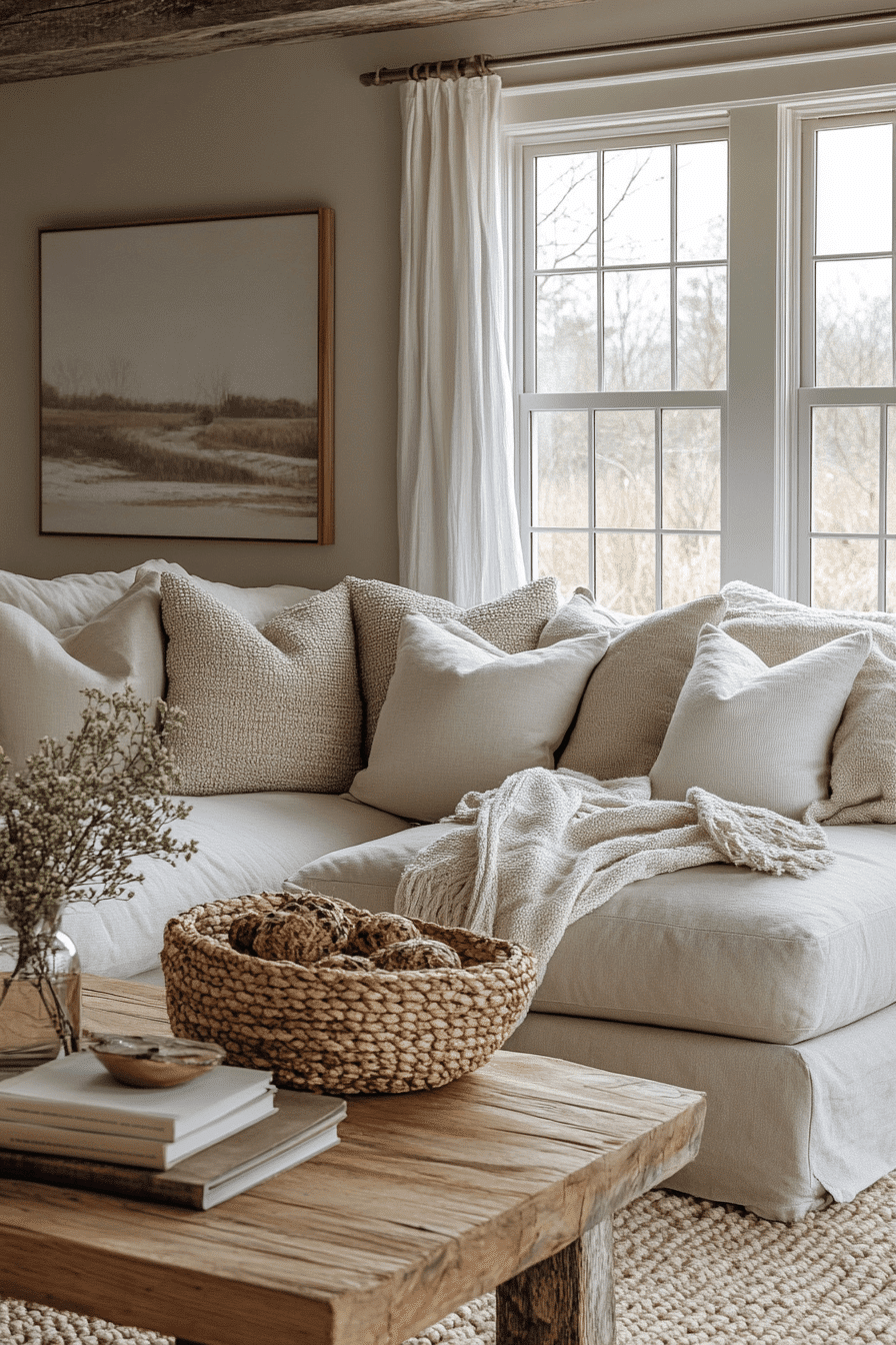 A farmhouse living room styled with warm earthy tones feels instantly inviting and cozy. Beige, soft brown, and muted cream shades create a harmonious color palette. Natural wood accents complement textured fabrics to enhance comfort and charm. Layered rugs and cushions make the space feel lived-in and relaxed. This farmhouse living room design offers both warmth and elegance in one setting. Click or tap here to explore more warm farmhouse ideas.