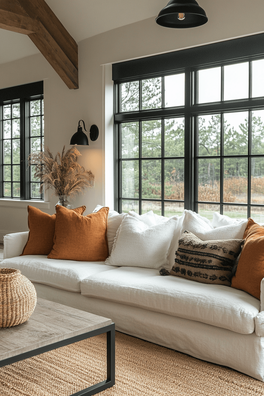 A farmhouse living room with matte black accents introduces a modern edge to rustic design. Black hardware, light fixtures, or trims contrast beautifully against neutral walls and soft furnishings. The bold touches elevate the space while keeping it grounded and timeless. Wood tones balance the darker details for a cohesive aesthetic. This farmhouse living room style feels chic, fresh, and sophisticated. Tap to discover more matte black farmhouse inspirations.