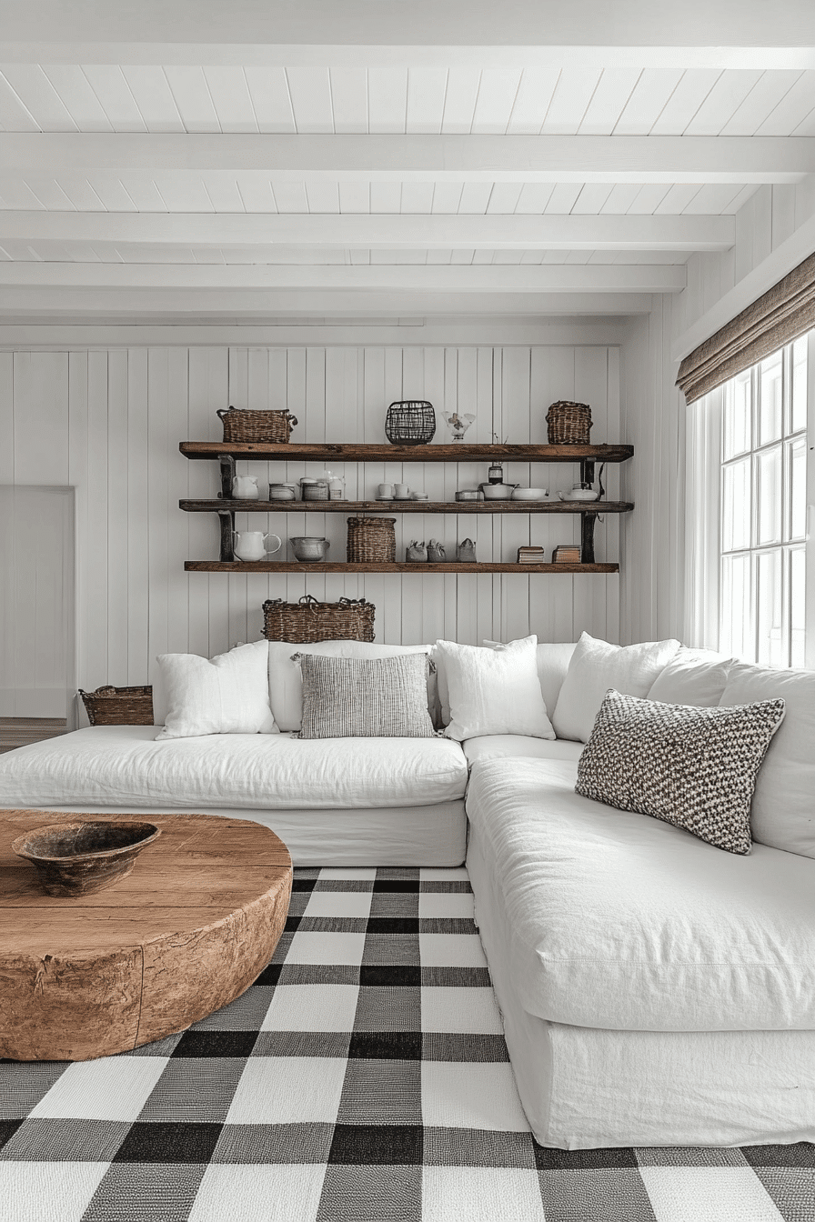 Checkerboard farmhouse living room features striking patterned floors for visual impact. Black-and-white tiles contrast beautifully with neutral furniture and wooden accents. Simple textiles and minimal décor allow the flooring to be the star. Natural light highlights the bold design while keeping the vibe cozy. This farmhouse living room style blends playful character with timeless charm. Tap now to explore more checkerboard farmhouse looks.