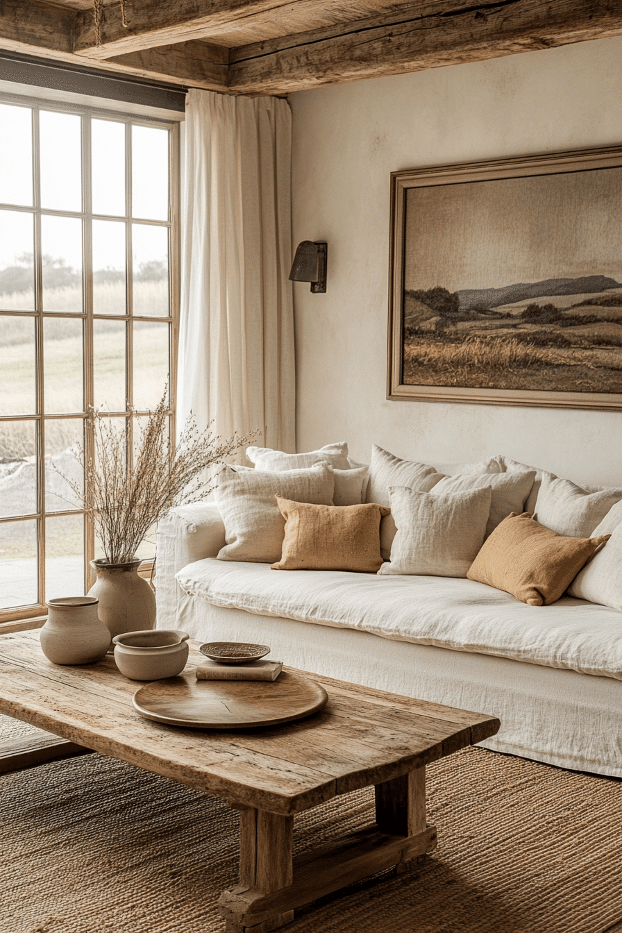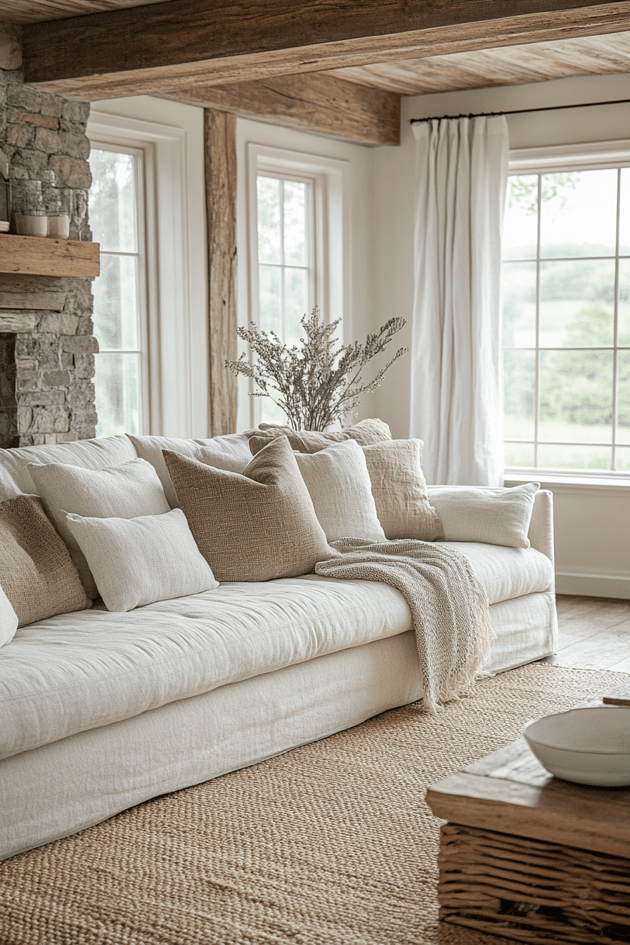 A layered farmhouse living room thrives on combining different materials for depth and warmth. Woven rugs, soft curtains, and plush cushions create a welcoming environment. Natural wood accents ground the design while maintaining a rustic charm. Neutral colors ensure that textures remain the focal point. This farmhouse living room approach feels balanced, cozy, and visually engaging. Tap here to discover more layered farmhouse inspirations.