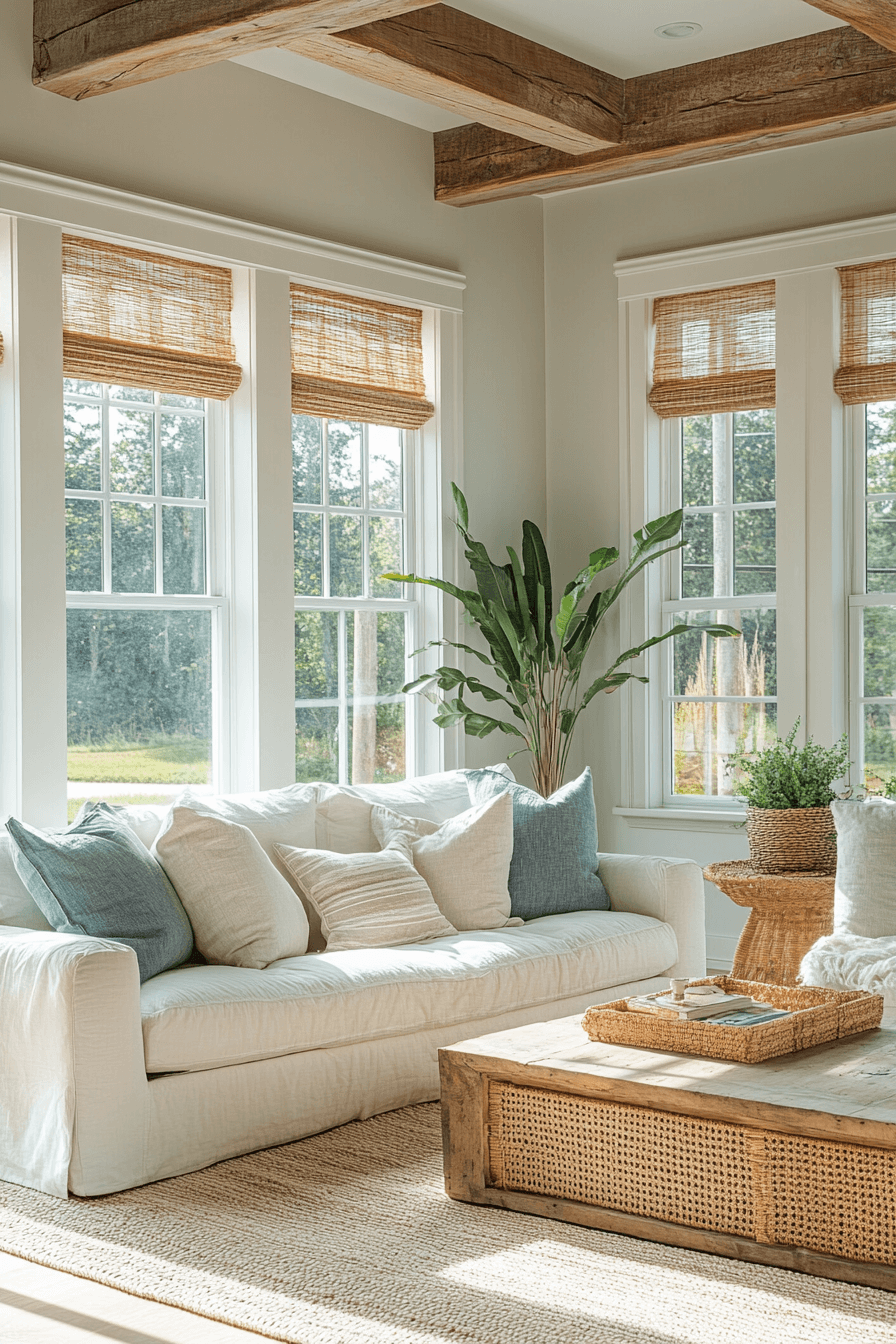 Coastal farmhouse living room merges rustic comfort with breezy coastal vibes. Light wood tones, soft linens, and sandy neutrals create a fresh, relaxing ambiance. Subtle nautical accents complement the farmhouse aesthetic without overpowering it. Open layouts keep the space airy and inviting. This farmhouse living room design is perfect for bright, calming interiors. Click to explore more coastal farmhouse living ideas.