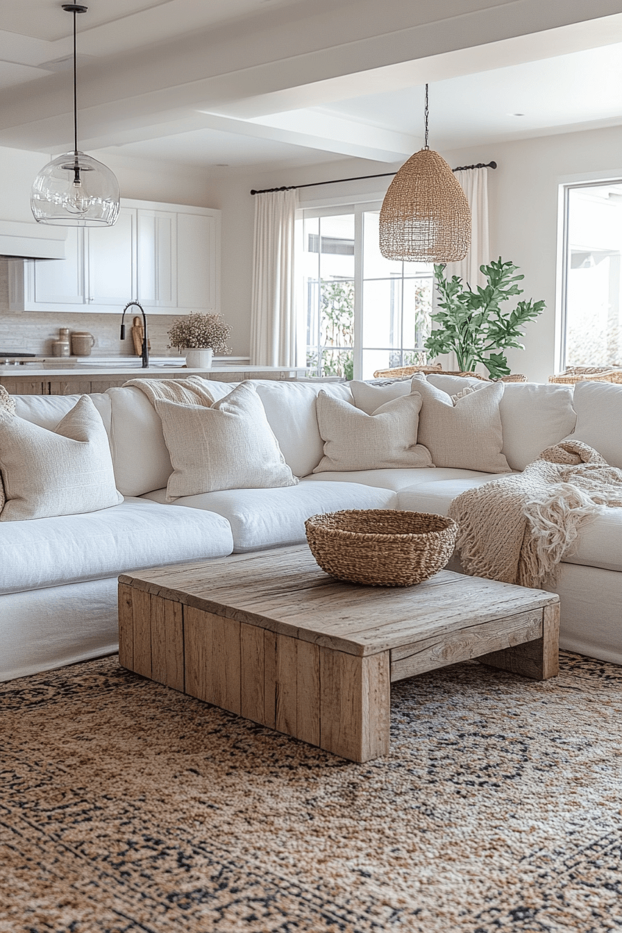 Modern farmhouse living room blends clean lines with rustic charm for a balanced, welcoming atmosphere. Neutral walls pair beautifully with soft textiles and natural wood accents for a fresh and cozy look. The open layout allows furniture to breathe, creating a sense of space and comfort. Subtle touches like textured throws and layered rugs add depth without cluttering the design. This farmhouse living room style offers the perfect mix of functionality and timeless appeal. Click or tap here to see more modern farmhouse inspirations.