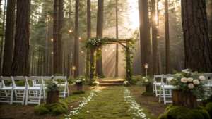 Let your imagination run wild with forest wedding ideas that feel like stepping into a magical realm. Think floating candles in the trees, vintage candelabras, and subtle fog rolling through a secluded glen. Add a harpist or live acoustic music for a storybook atmosphere. These mystical settings evoke awe and wonder with every detail. It’s an unforgettable experience filled with visual poetry and natural splendor. Tap now to dive into magical woodland wedding settings!