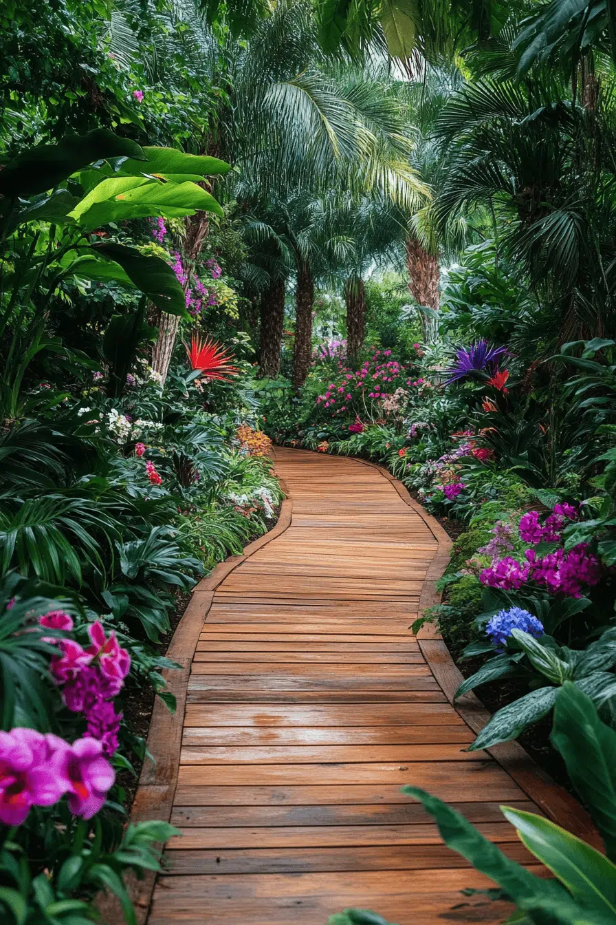 Embrace the lush, vibrant aesthetics of the tropics with this garden design idea. Incorporating exotic plants like palms and bird of paradise, this garden transports you to a tropical getaway right in your backyard. Use layers of different heights and textures to create a dense, green environment. Water features and colorful flowering plants enhance the jungle-like feel.