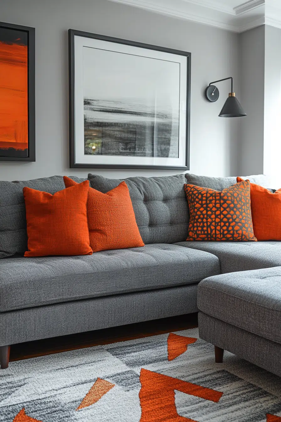 Create a sleek grey and orange living room by pairing bold orange elements with grey modern furniture. This combination can be sleek and edgy, ideal for a contemporary space that wants to make a statement. Think orange modern art, grey sleek sectionals, and high-gloss finishes to emphasize a futuristic vibe. This design is perfect for urban dwellers who love a clean, bold look.