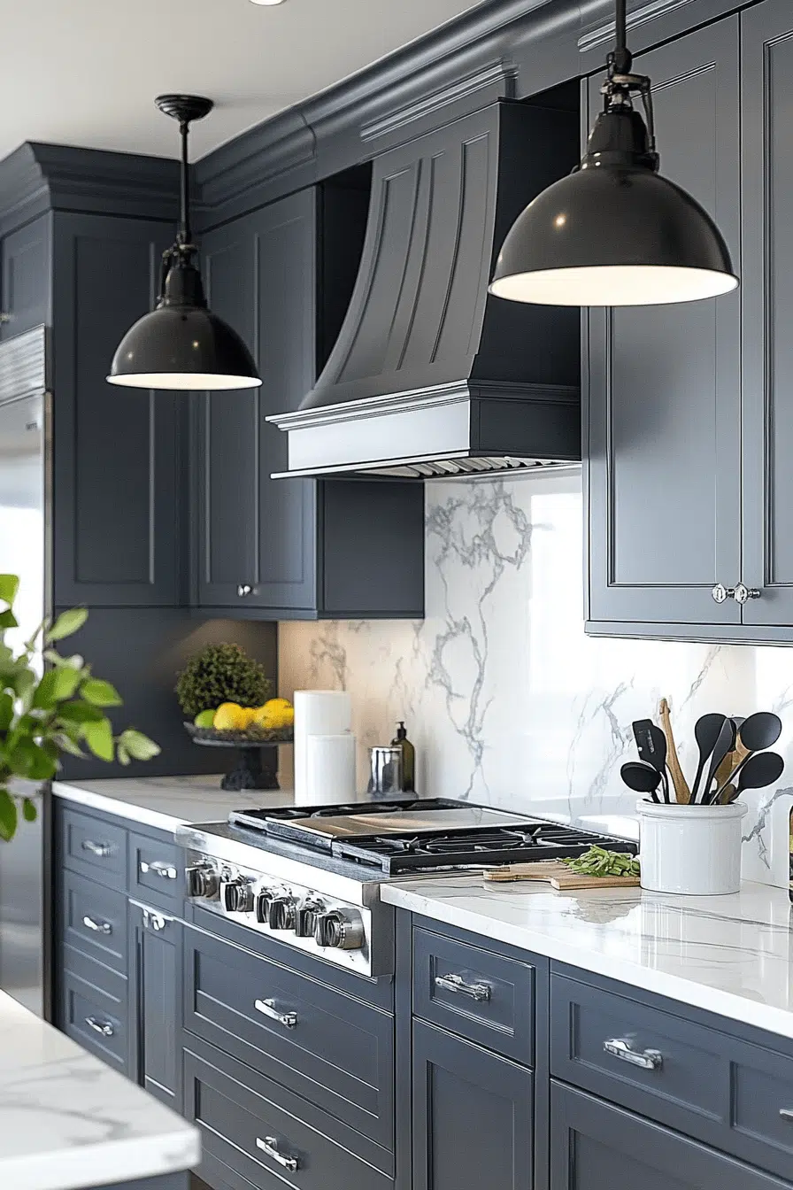 This stormy grey and white combination creates the perfect kitchen for confident cooks who want their space to make a statement. The dramatic contrast feels both luxurious and energizing for daily meal prep.