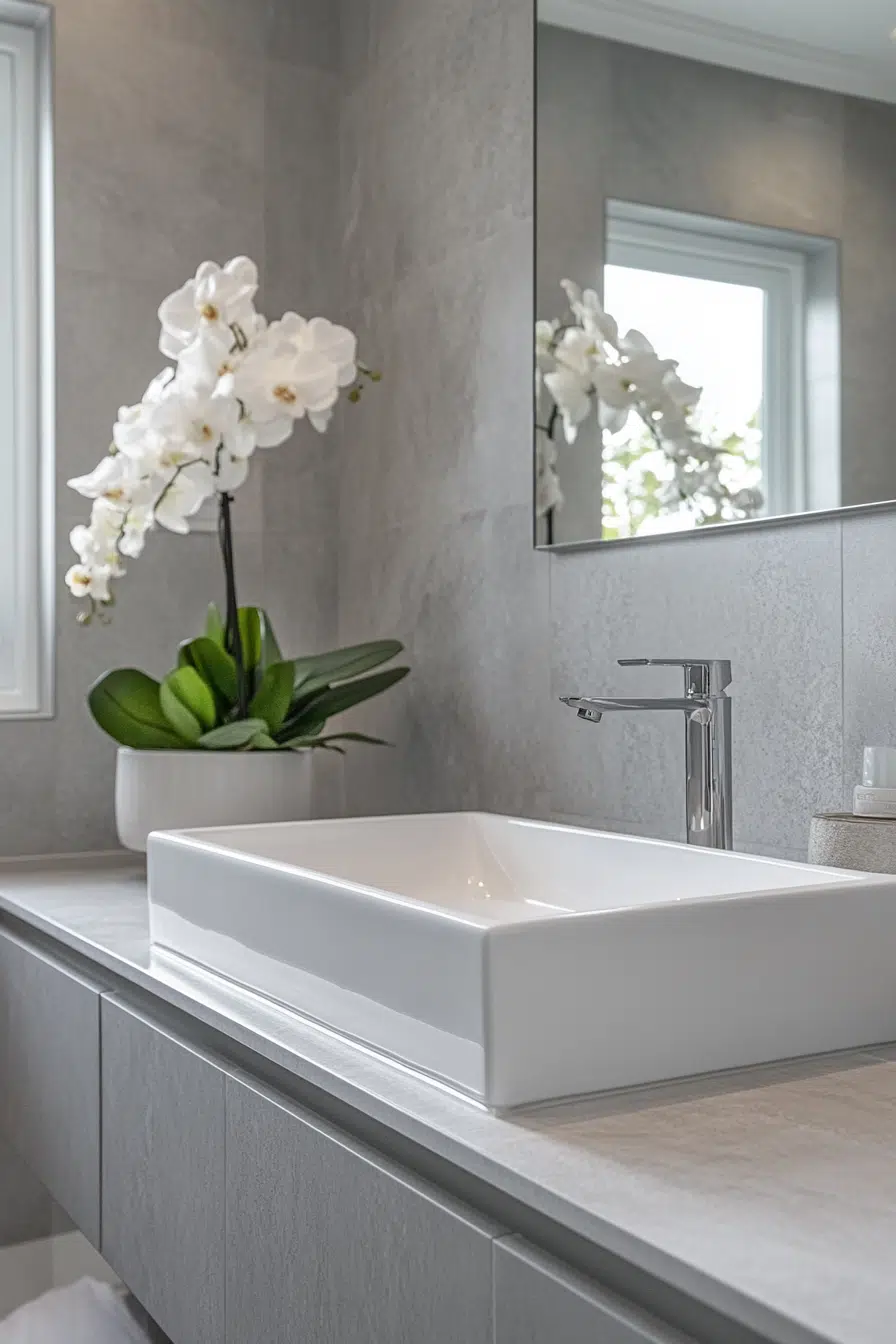 Streamlined Grey Sanctuary bathroom decor emphasizes efficiency and sleek design, featuring built-in cabinetry and integrated sinks in shades of grey. The clean lines and lack of unnecessary ornamentation ensure the space feels calm and uncluttered. Hidden storage and discreet fixtures maintain the streamlined look, making the bathroom easy to clean and enjoy. This style is ideal for those who value a tidy and orderly bathroom environment.