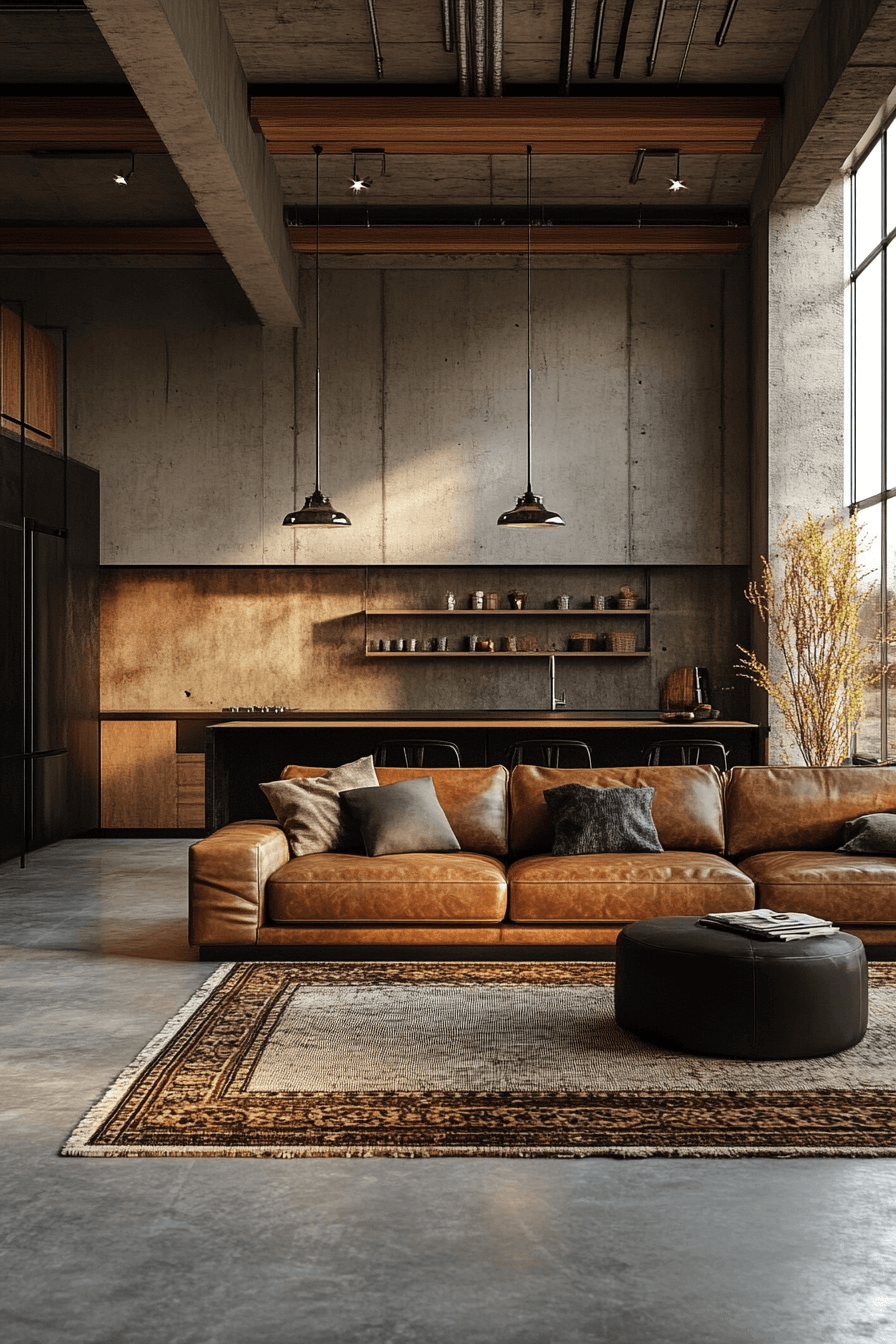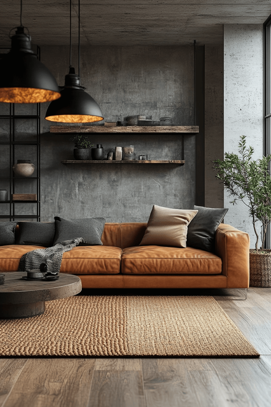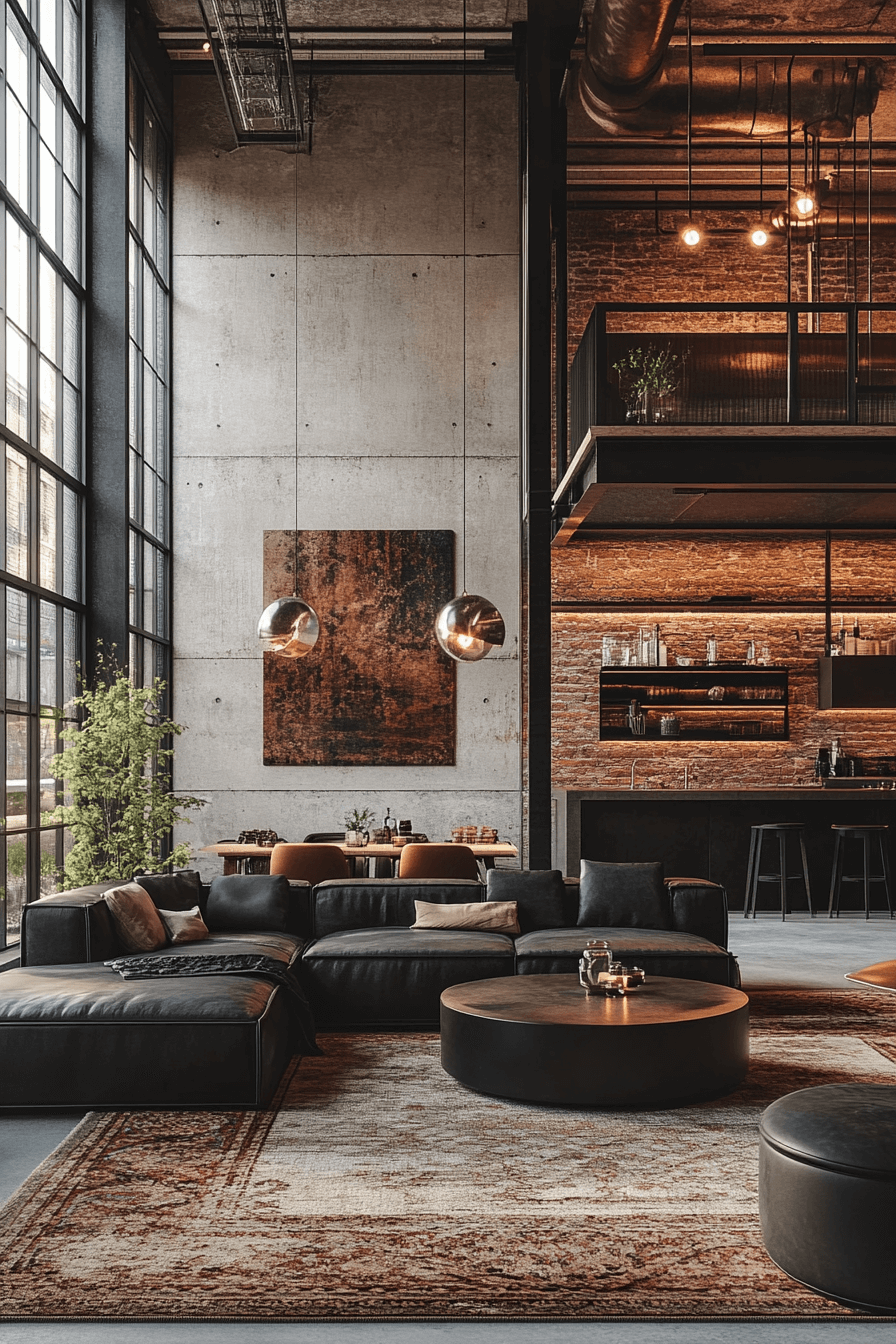 Bold contrasts define this industrial living room style, with dark furniture against light concrete or brick walls. Black leather sofas and matte steel tables create strong visual impact. Large industrial lighting fixtures in metallic tones enhance the vibe. Warm accents like rugs and throws balance the stark palette. This setup delivers dramatic style without sacrificing comfort. Click here to explore bold industrial contrast inspirations.