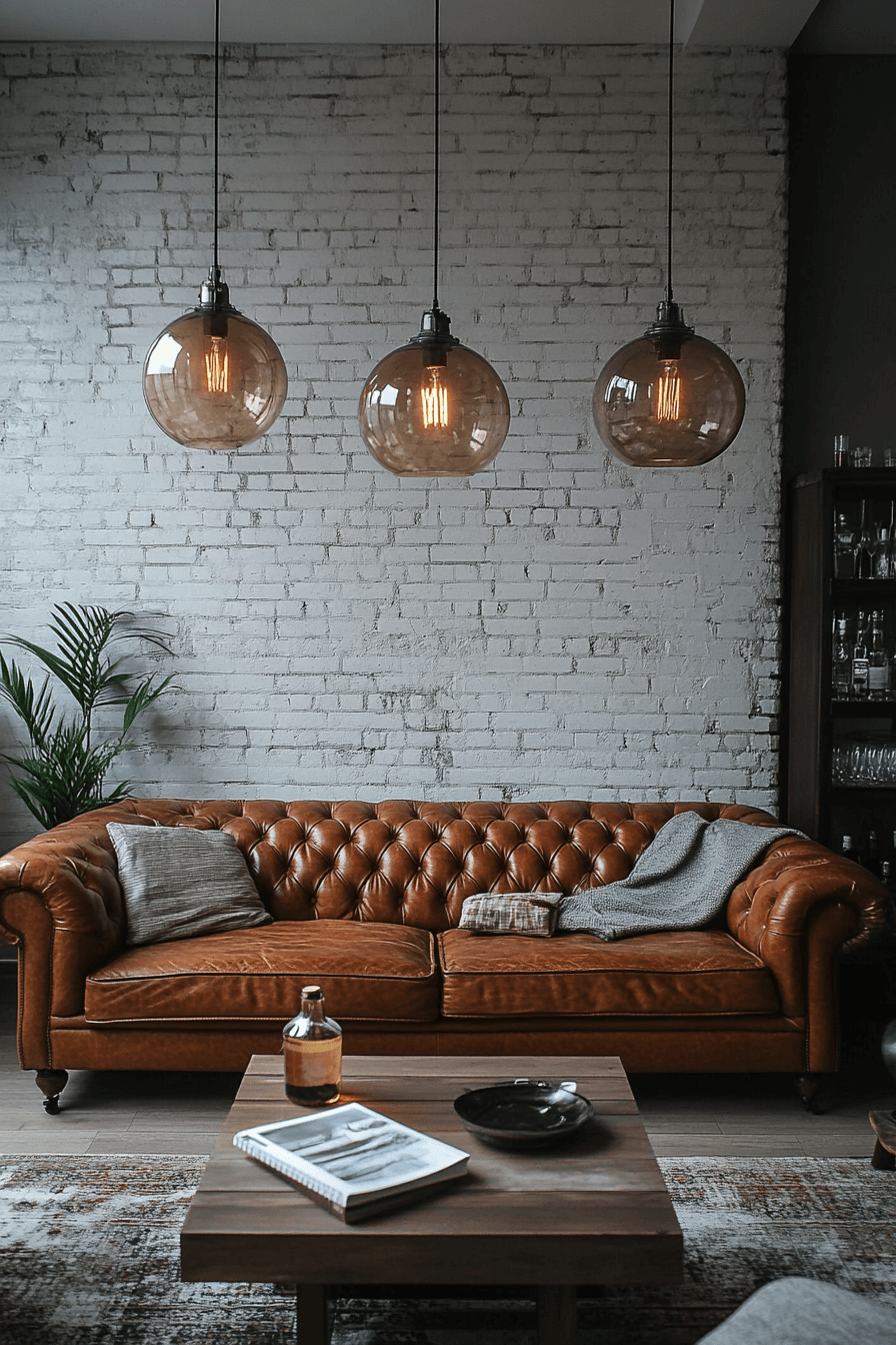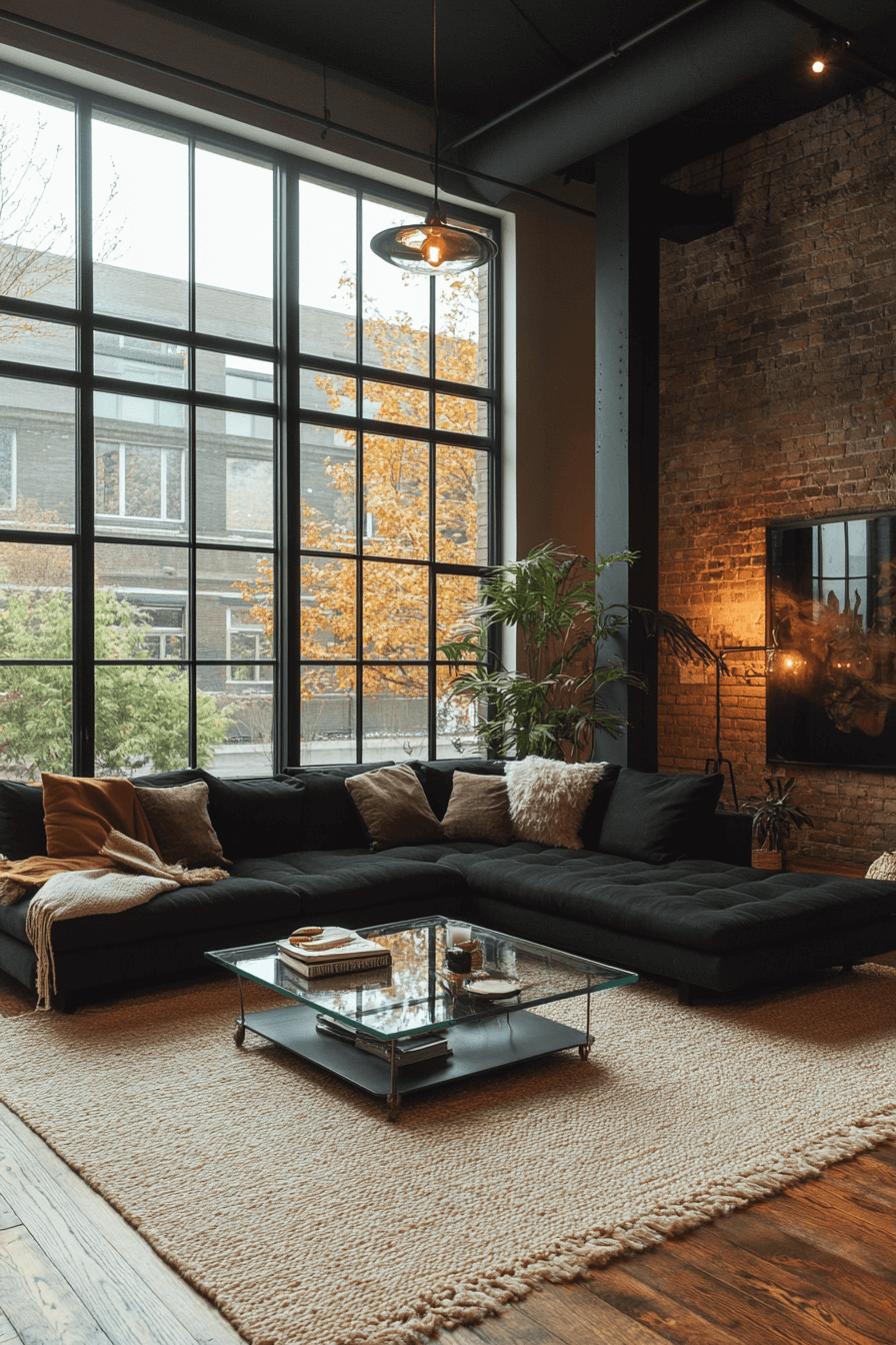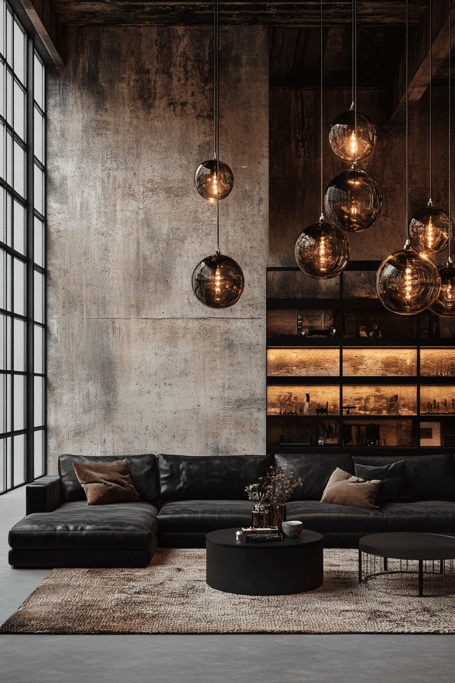 Bold contrasts define this industrial living room style, with dark furniture against light concrete or brick walls. Black leather sofas and matte steel tables create strong visual impact. Large industrial lighting fixtures in metallic tones enhance the vibe. Warm accents like rugs and throws balance the stark palette. This setup delivers dramatic style without sacrificing comfort. Click here to explore bold industrial contrast inspirations.