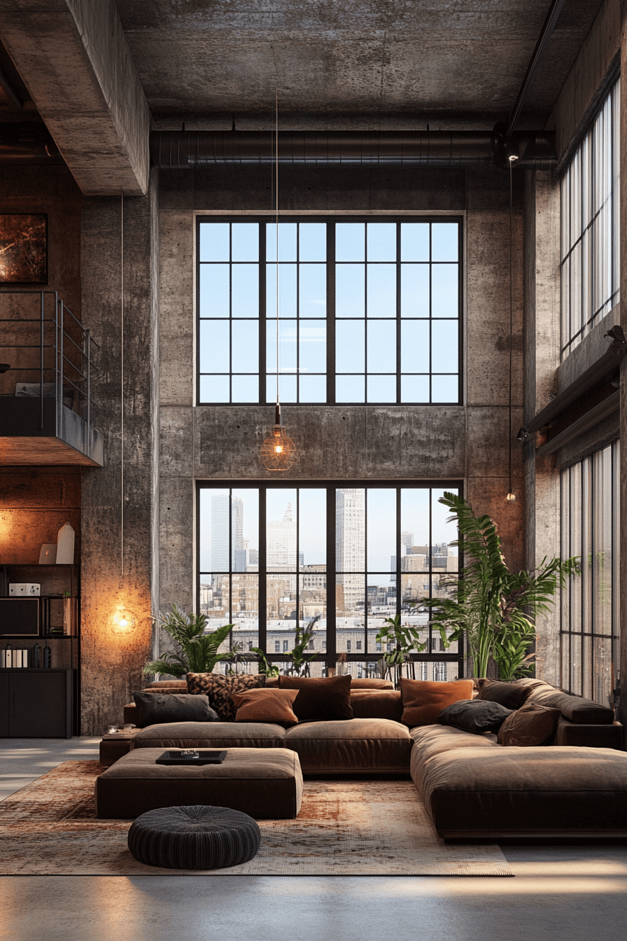 A city loft-inspired industrial living room highlights open layouts, exposed walls, and bold finishes. Tall ceilings with ductwork enhance the urban aesthetic. Neutral-toned furniture balances the rugged architectural elements. Large windows framed in steel flood the space with light. The design combines metropolitan energy with modern comfort seamlessly. Click here to see more industrial city loft designs.