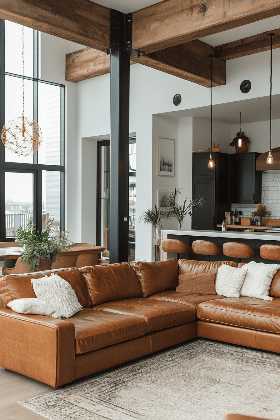 Open layouts define an open-concept industrial living room, maximizing space and light. Exposed ceilings, ductwork, and wide windows emphasize the warehouse aesthetic. A sectional sofa anchors the seating area without breaking the flow. Minimal partitions keep the room airy and inviting. The result is a functional, urban-inspired design. Click here to uncover more open concept industrial inspirations.