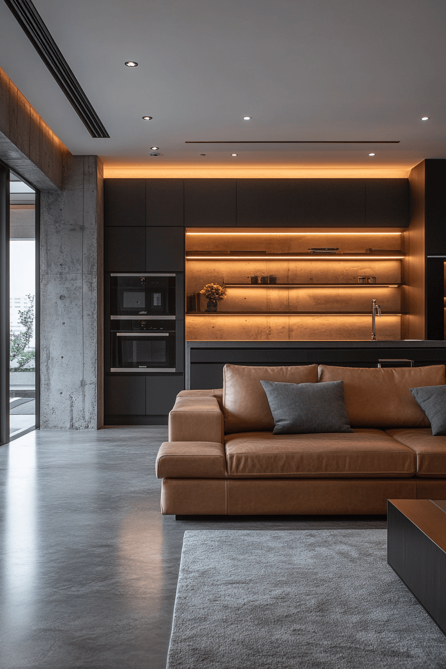 A contemporary industrial living room blends modern finishes with raw textures for a chic look. Polished concrete floors pair with dark metal accents seamlessly. Ambient lighting creates a glowing, cozy vibe. Sleek furniture in neutral shades enhances the balance. This style feels both upscale and approachable. Tap here to see more contemporary industrial glow ideas.