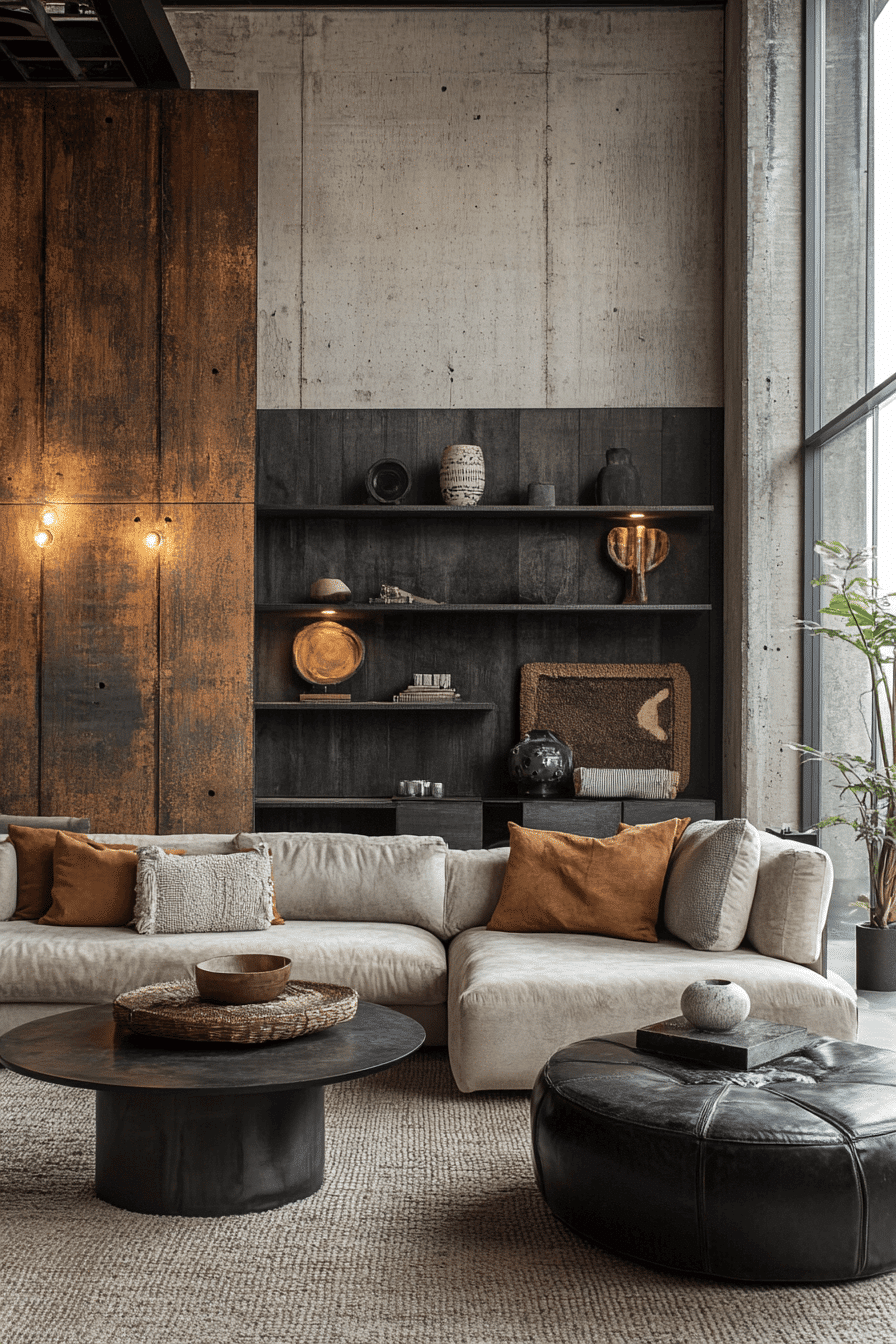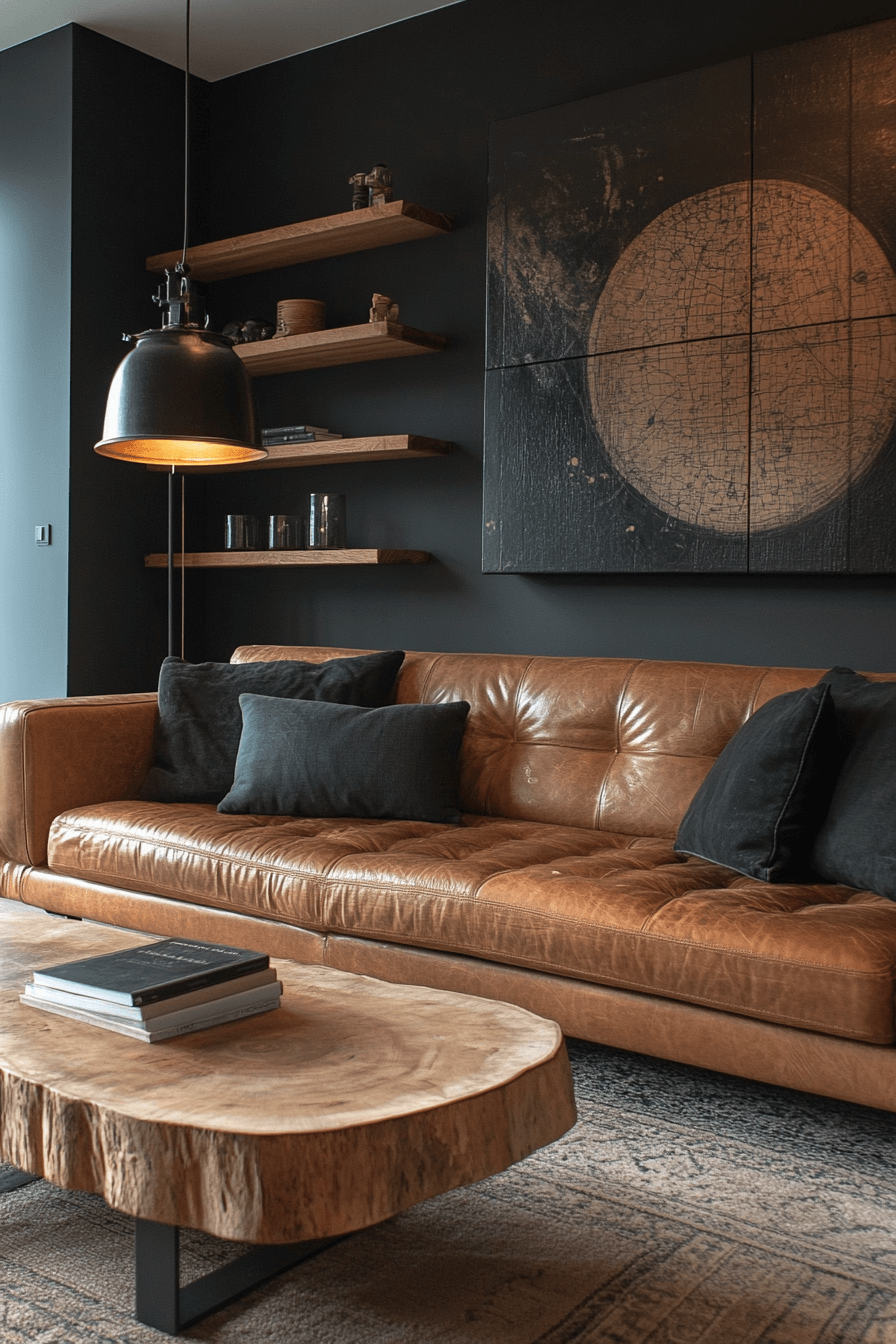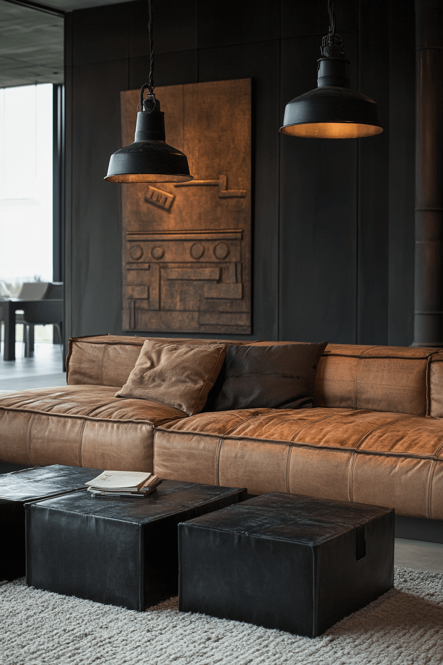 A dark-toned industrial living room creates a moody, luxurious atmosphere. Charcoal walls and dark leather sofas set the stage. Metallic coffee tables and shelving add brightness without disrupting the vibe. Accent lighting provides just enough warmth for comfort. This style is perfect for creating an intimate, edgy retreat. Tap here to see more dark-toned industrial retreat inspirations.