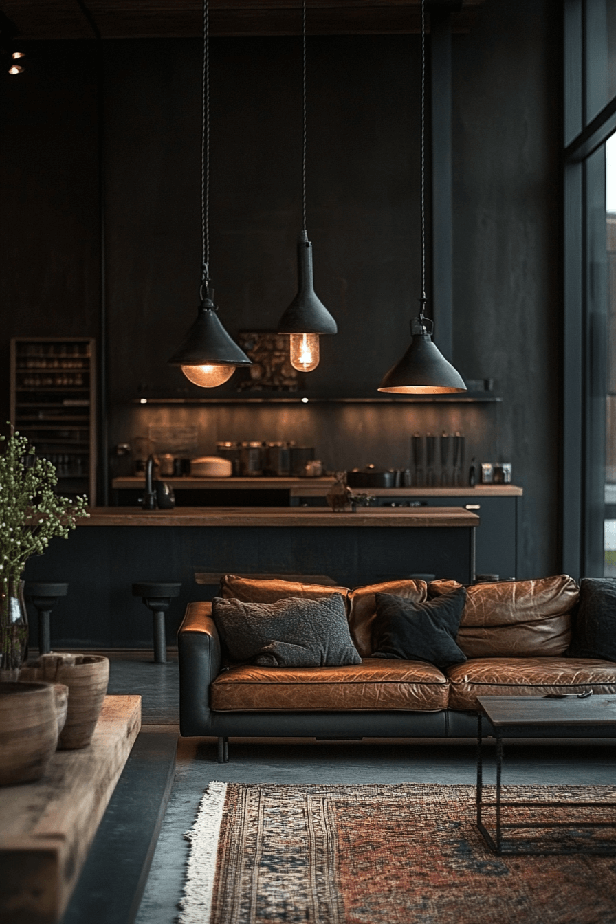 A dark industrial living room makes a bold statement with deep colors, matte finishes, and sleek textures. Black and charcoal tones dominate the palette, with leather sofas providing comfort and contrast. Exposed brick or concrete walls add raw character to the design. Modern lighting fixtures in metallic finishes enhance the moody vibe. This setup is perfect for creating a cozy yet sophisticated retreat. Tap here to explore more dark industrial chic room ideas.